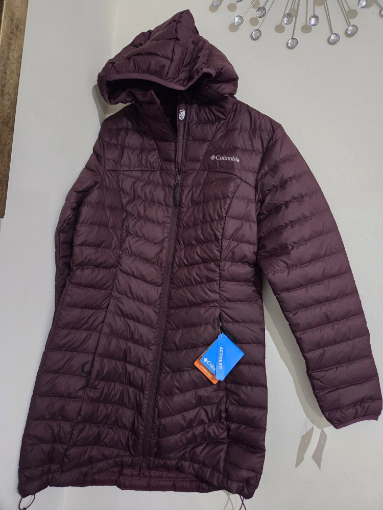Columbia women's puffer jacket in a lovely plum colour! It's an active fit and super lightweight and portable, perfect for layering or wearing on its own during milder weather. It's in great condition and ready for a new home! size small