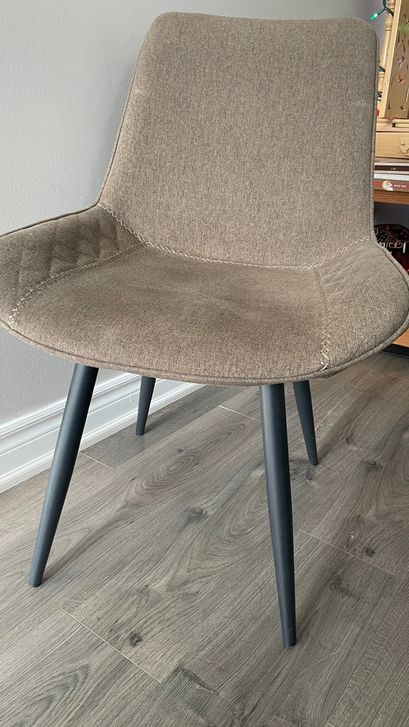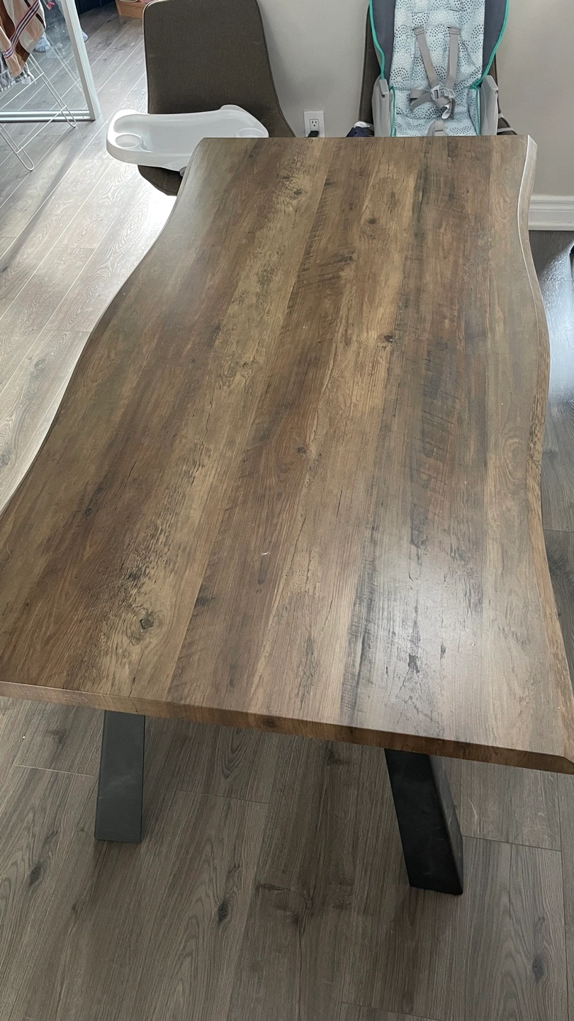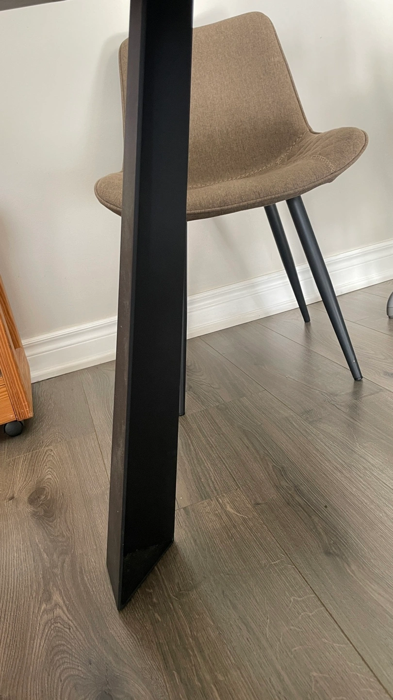 Modern dining table set with metal legs. Both chairs and table have strong metal legs and support underneath. No cracks. Chairs are Water repellent treated. Selling with 4 chairs. Seating capacity: 6 Size: 65inches x 36inches