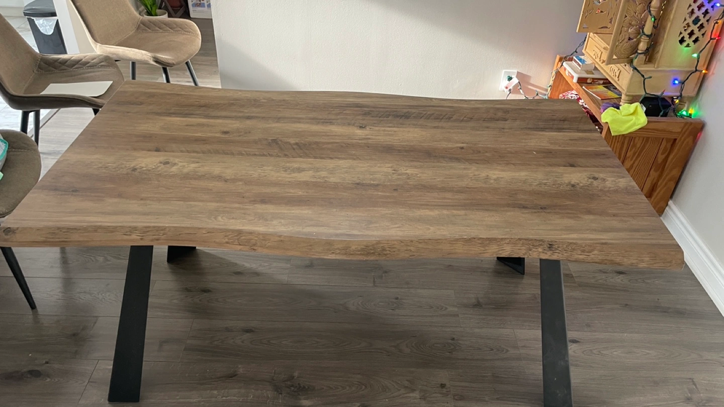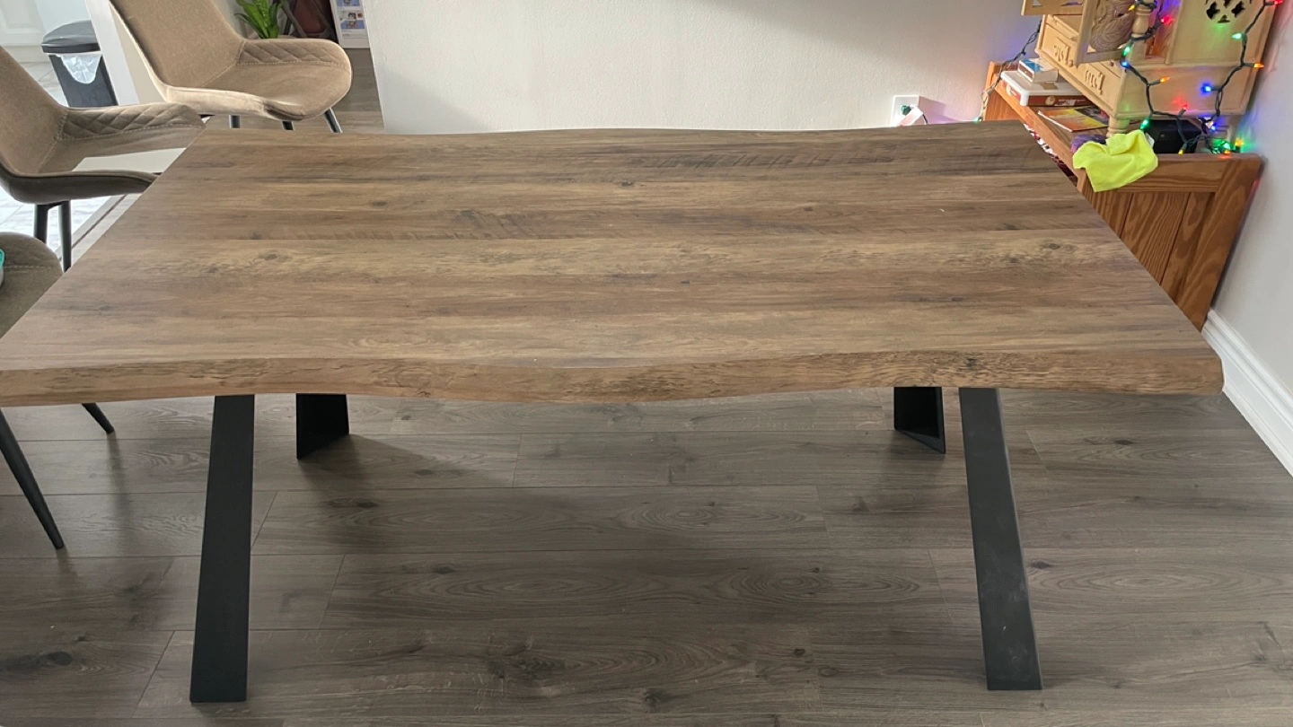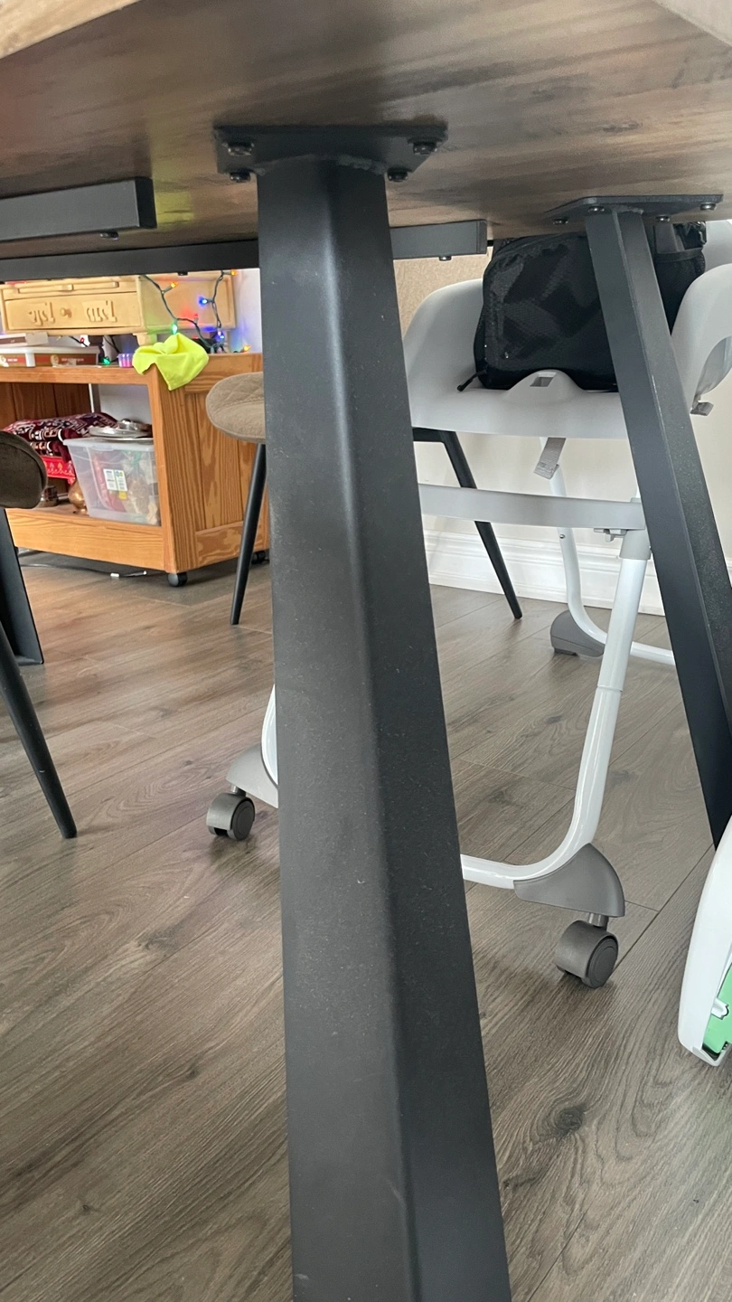 Modern dining table set with metal legs. Both chairs and table have strong metal legs and support underneath. No cracks. Chairs are Water repellent treated. Selling with 4 chairs. Seating capacity: 6 Size: 65inches x 36inches