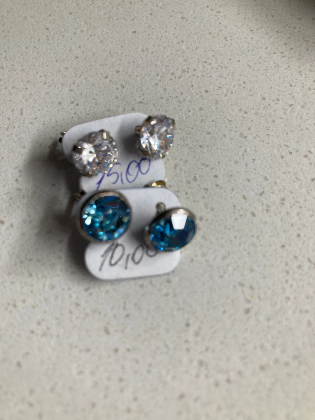 Two sets of new, never worn stud earrings with respectively a clear and a blue crystal gem. They were purchased in Brazil at a store specializing in gem stones as gifts for others. Truly a deal at 5 per pair, and they are ready to shine! Available for pickup, or I can also meet downtown as needed. 🌺 Please also check out my other items! 🥰