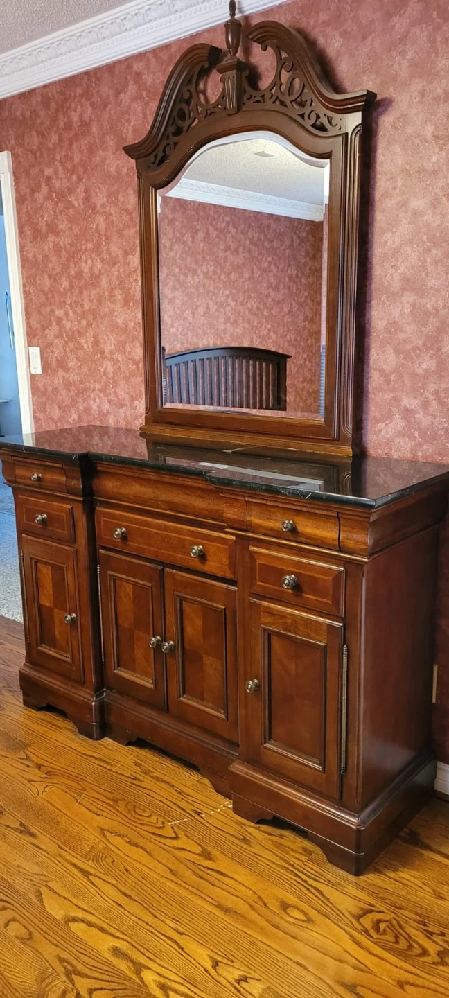 Selling a beautiful wood buffet with a matching mirror. It features a dark countertop and elegant wood detailing. It's a great piece for adding storage and style to your dining room or living space