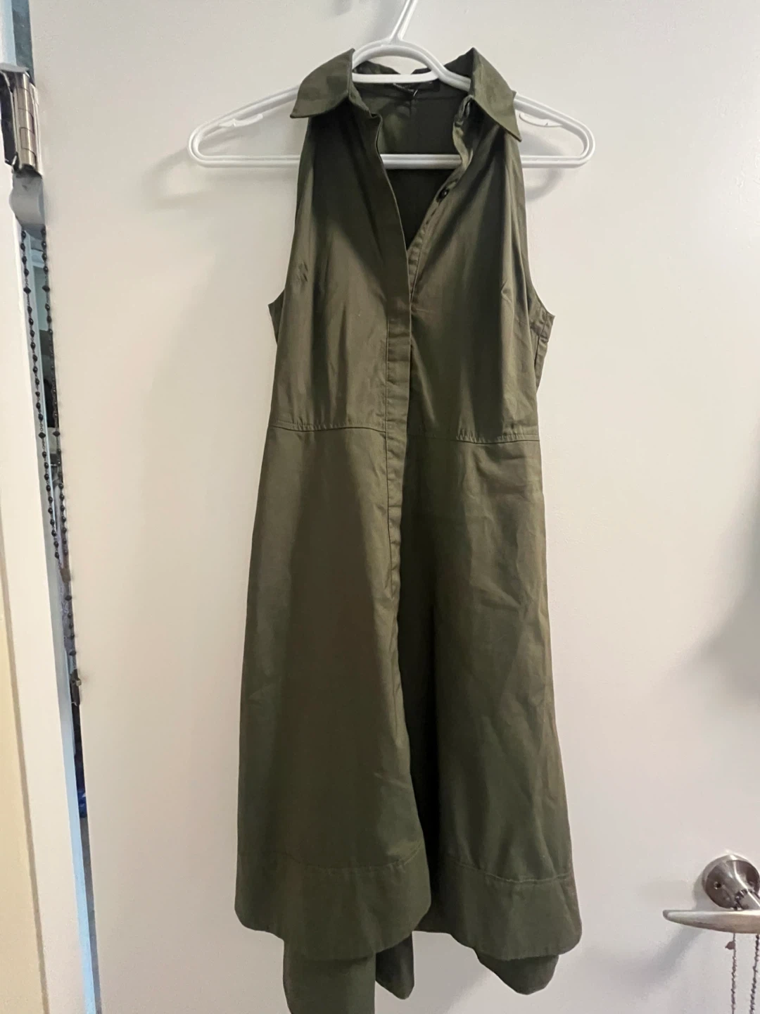 This is a gently used Banana Republic dress in olive green. It's a size 00 Petite, perfect for someone looking for a smaller fit. The dress is in great condition and ready for a new home! Pickup downtown and cash only !
