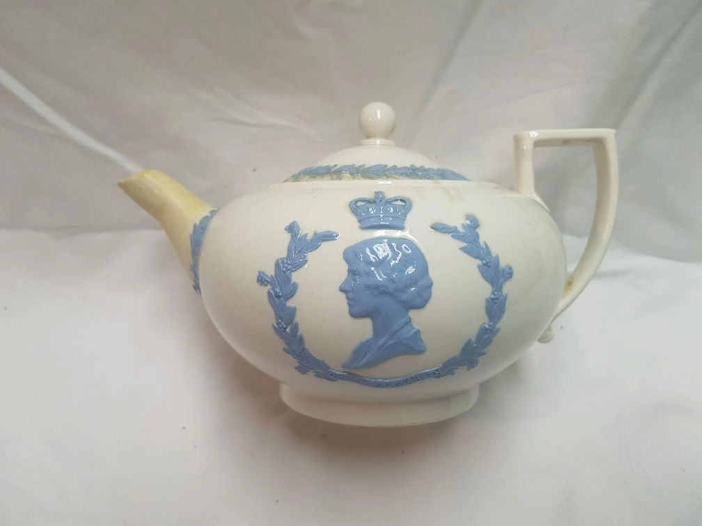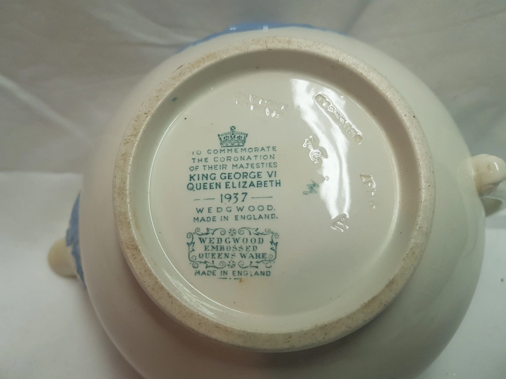 This Wedgwood teapot commemorates the coronation of King George VI and Queen Elizabeth in 1937. It's part of the Embossed Queens Ware collection and was made in England. A beautiful piece for any collector!