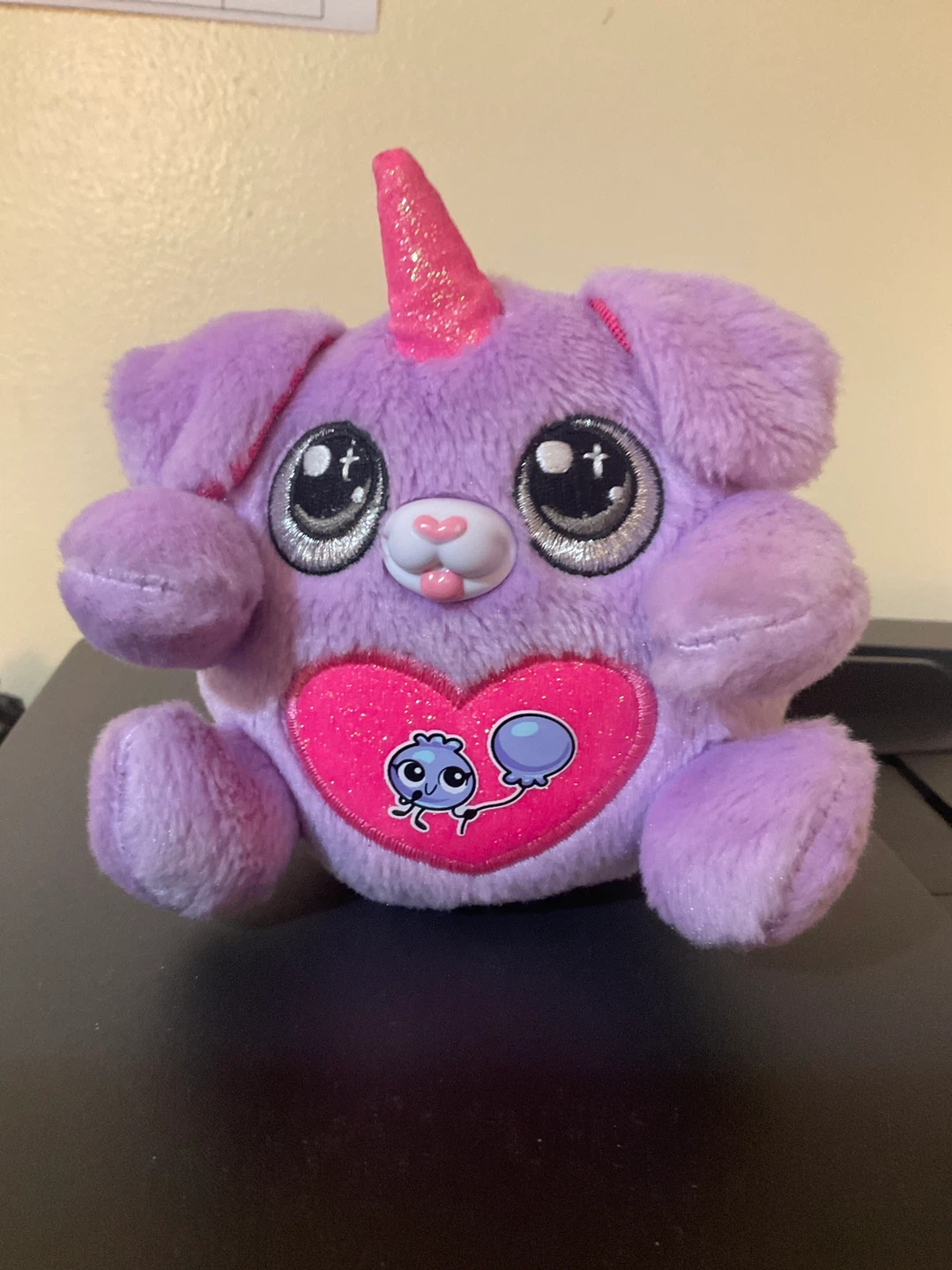 Selling a super cute Pikmi Pops plush toy! It's a purple unicorn dog with a pink heart and a little blueberry character on it. Perfect for kids or collectors!