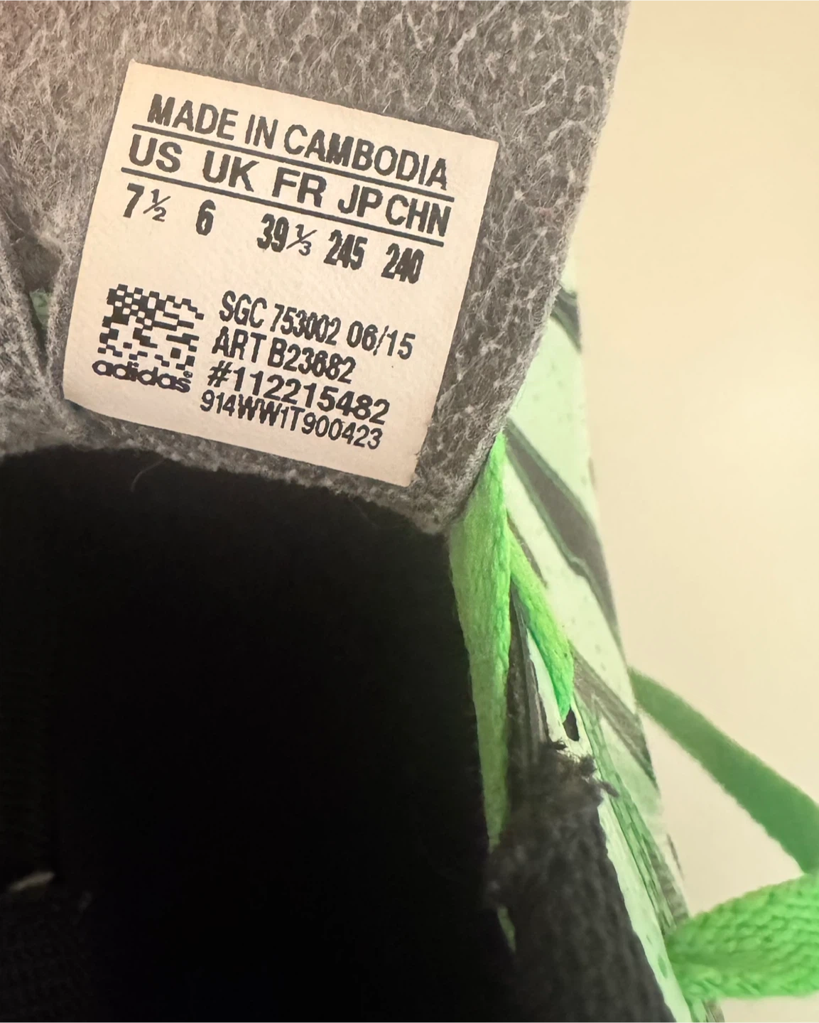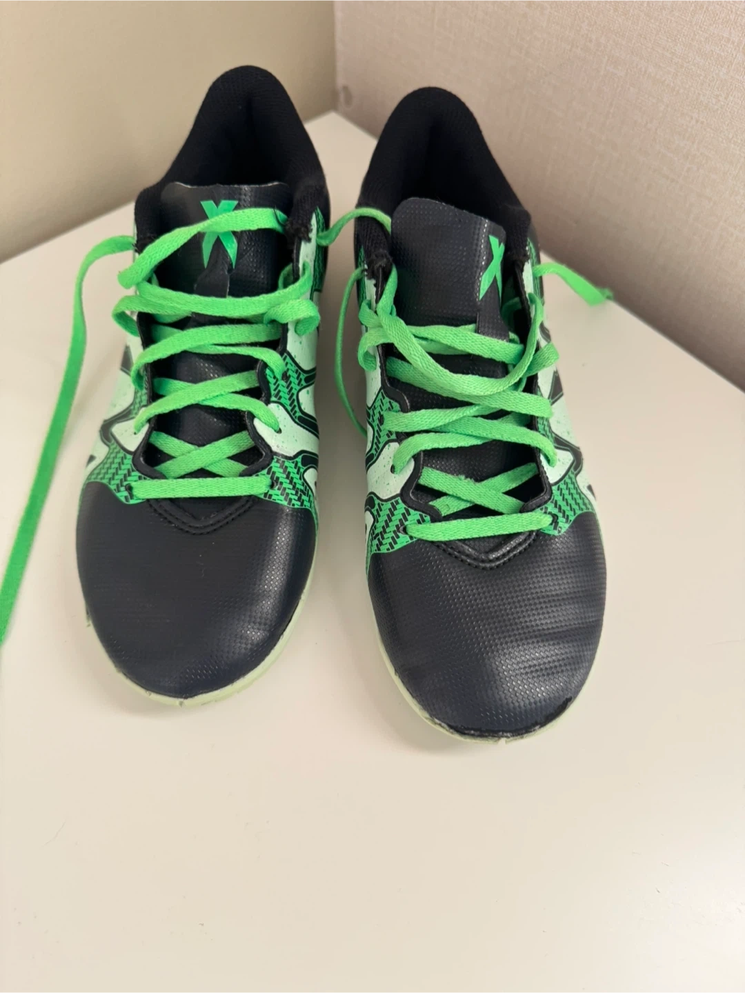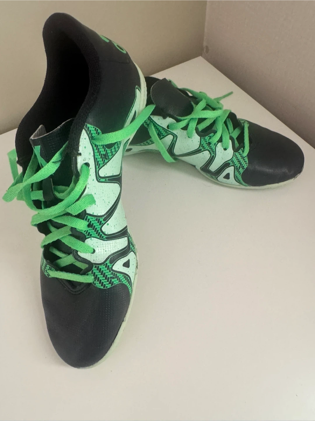 Selling a pair of Adidas X 15.2 FG/AG soccer shoes. They are a US size 7.5. The shoes are black with green accents. Woman’s Indoor