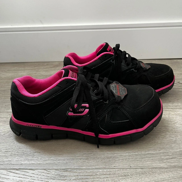 Step into comfort with these Skechers Flex Sole slip-resistant women's size 8 shoes, perfect for work or casual wear. These shoes feature a sleek black design with vibrant pink accents, offering both style and safety with every step. Additional features include: * Brand: Skechers * Style: Flex Sole Slip Resistant * Colour: Black with Pink accents * Size: Women's 8 * Condition: like new, barely used Looking at similar listings, I've priced these shoes at a competitive rate. And a friendly heads-up: if the ad is still up, the shoes are still available!