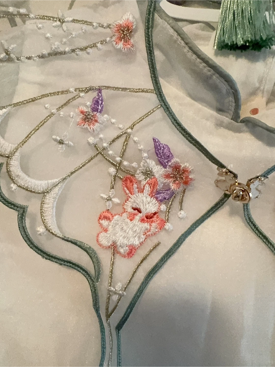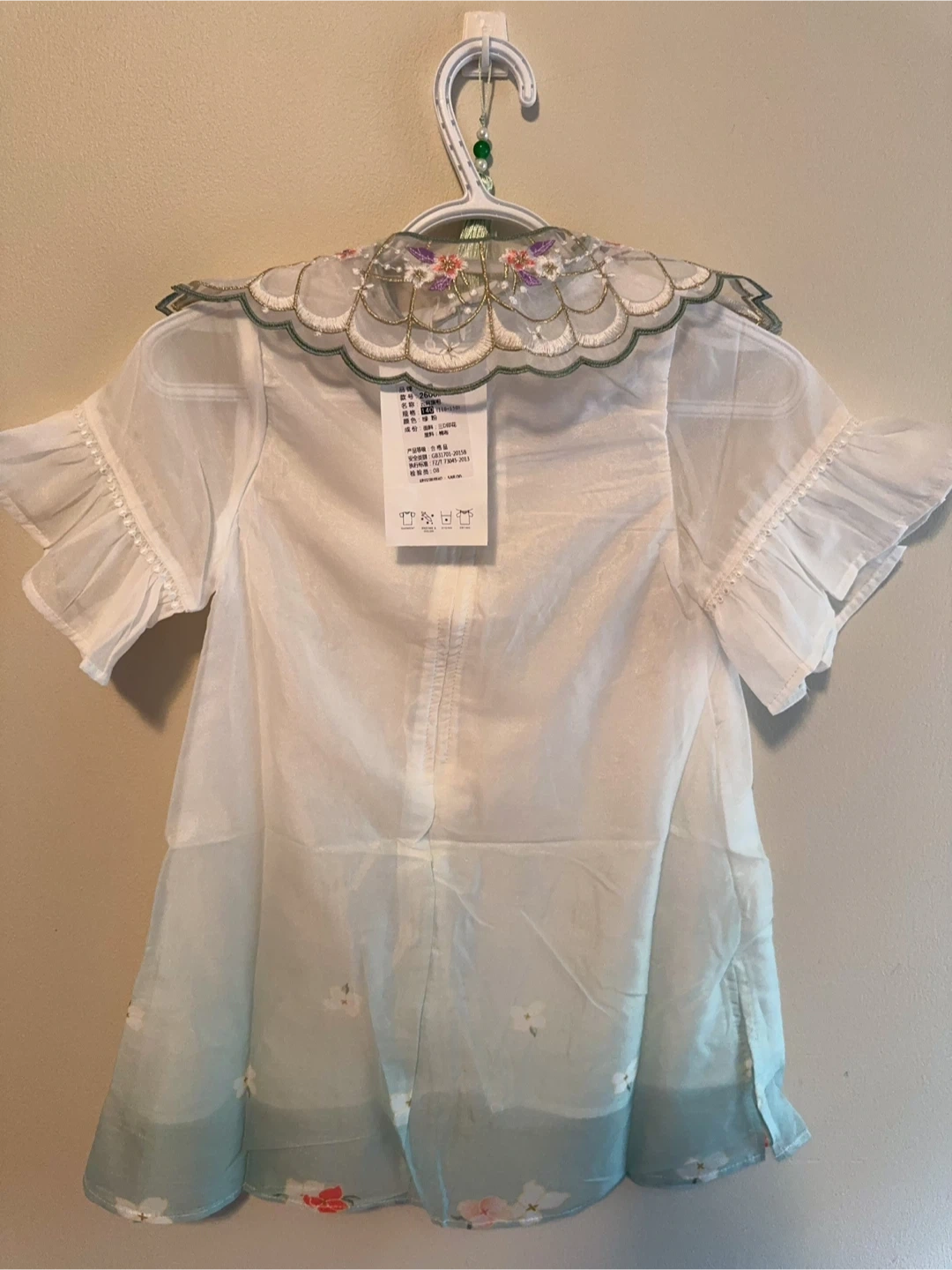 This is a cute white dress for girls, featuring delicate embroidery. The dress has short, ruffled sleeves and a unique collar design with floral and rabbit embroidery. The bottom of the dress has a subtle blue gradient with floral details as well. It's perfect for a special occasion or just a fun day out!