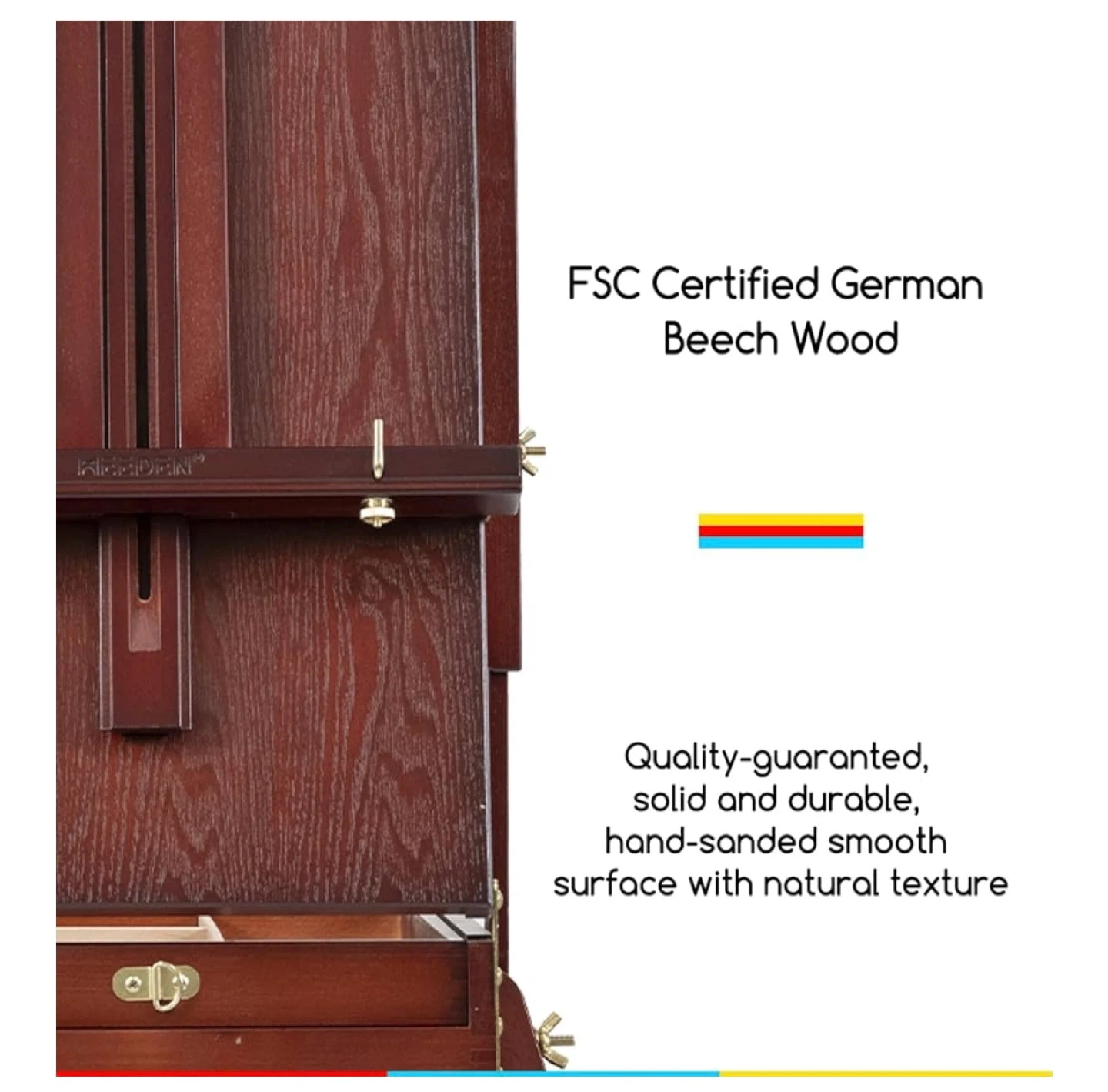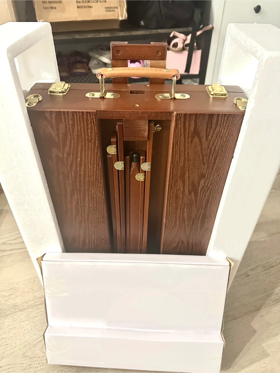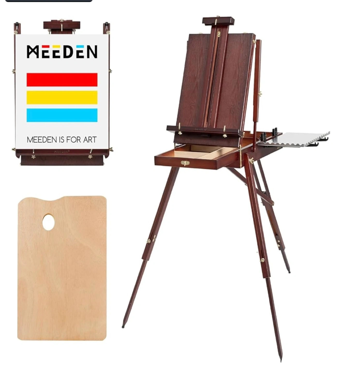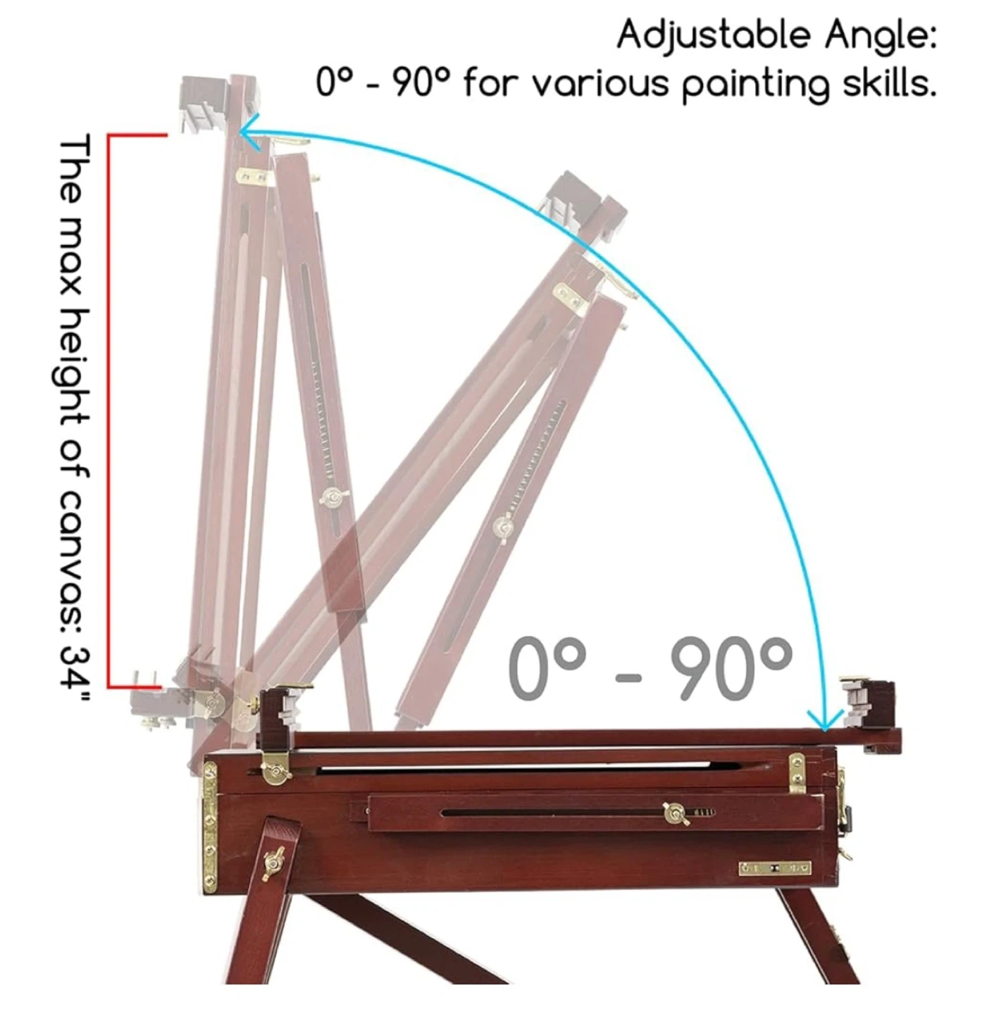 This is a MEEDEN convertible easel sketchbox. It features: - Unique aluminum side tray design with brush holders and two hooks - Removable drawer with customized dividers and built-in storage room to help keep all your painting supplies organized - Portable & Foldable - Leather handle for easy carry - Adjustable shoulder strap for immediate travel - Adjustable Angle: 0° - 90° for various painting skills - The max height of canvas: 34" - Dimensions: 13.8"W x 9"D