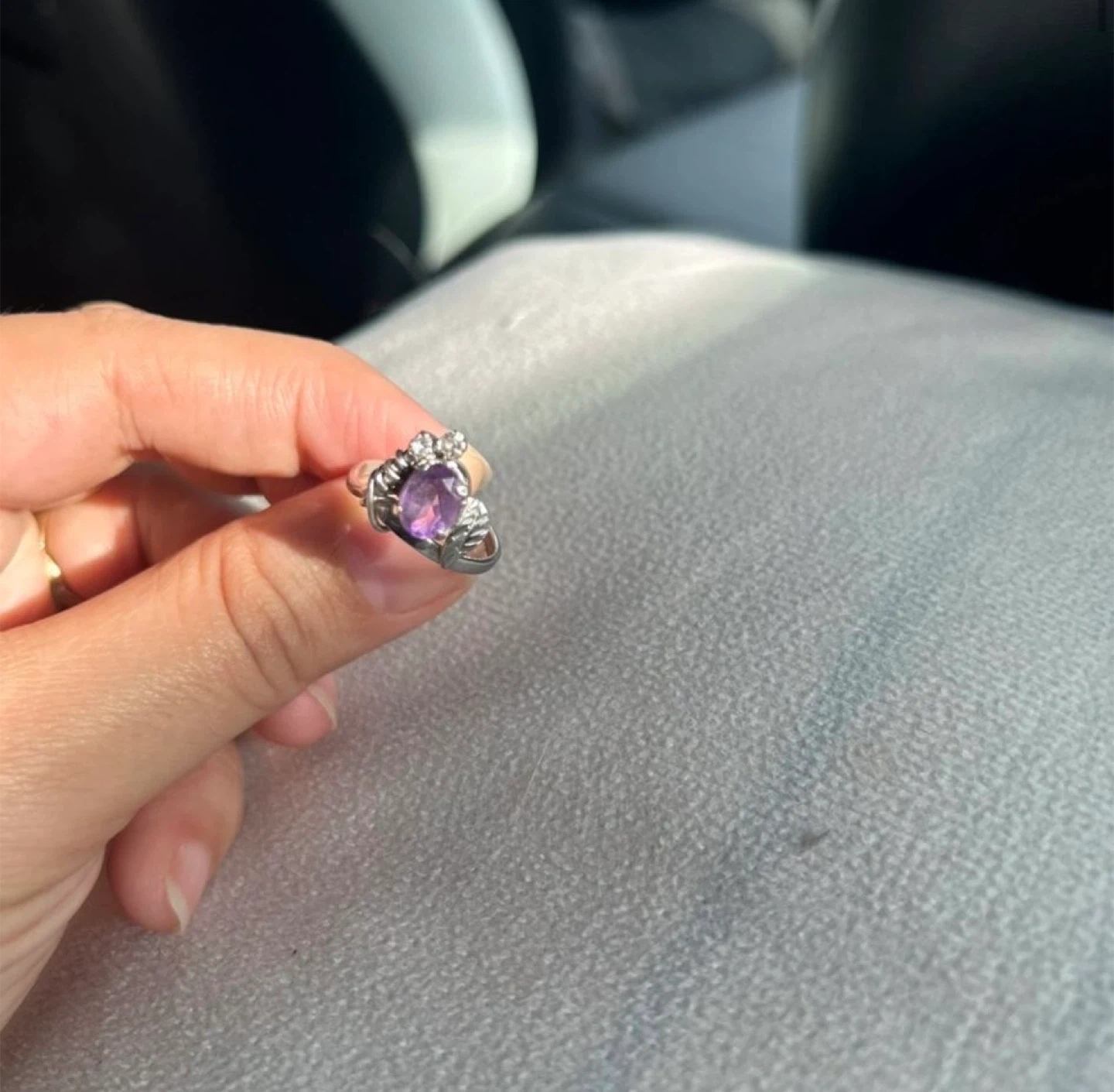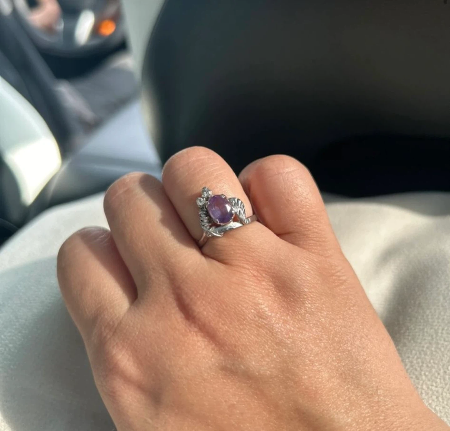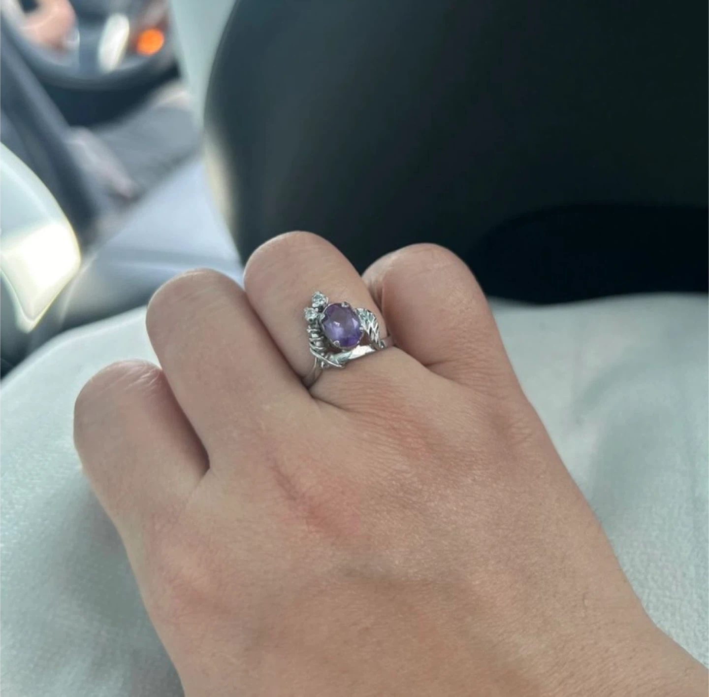 Selling a lovely purple amethyst ring featuring a beautiful purple stone. It has a unique design with leaf-like details surrounding the stone. It's in great condition and ready to be worn!