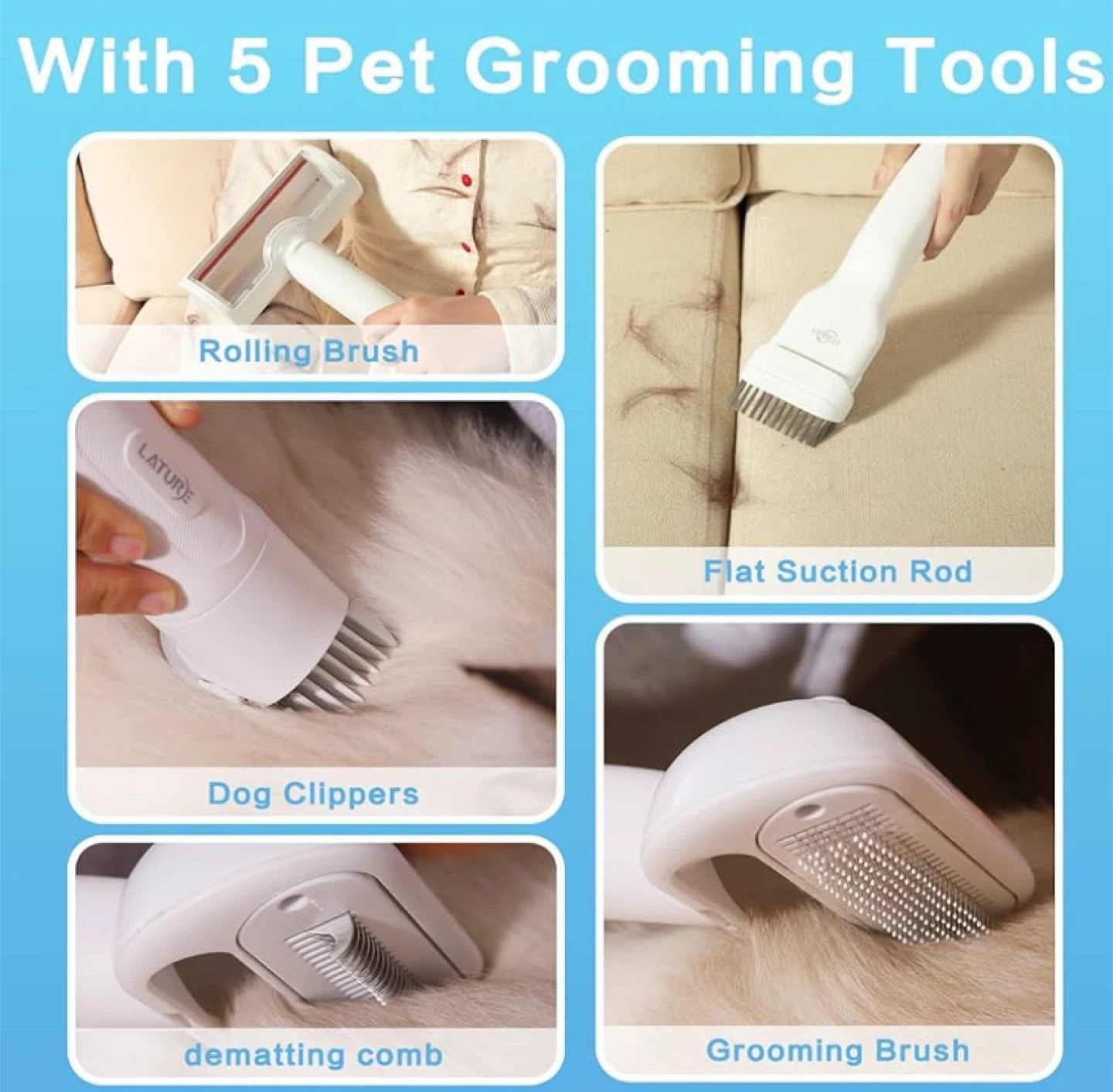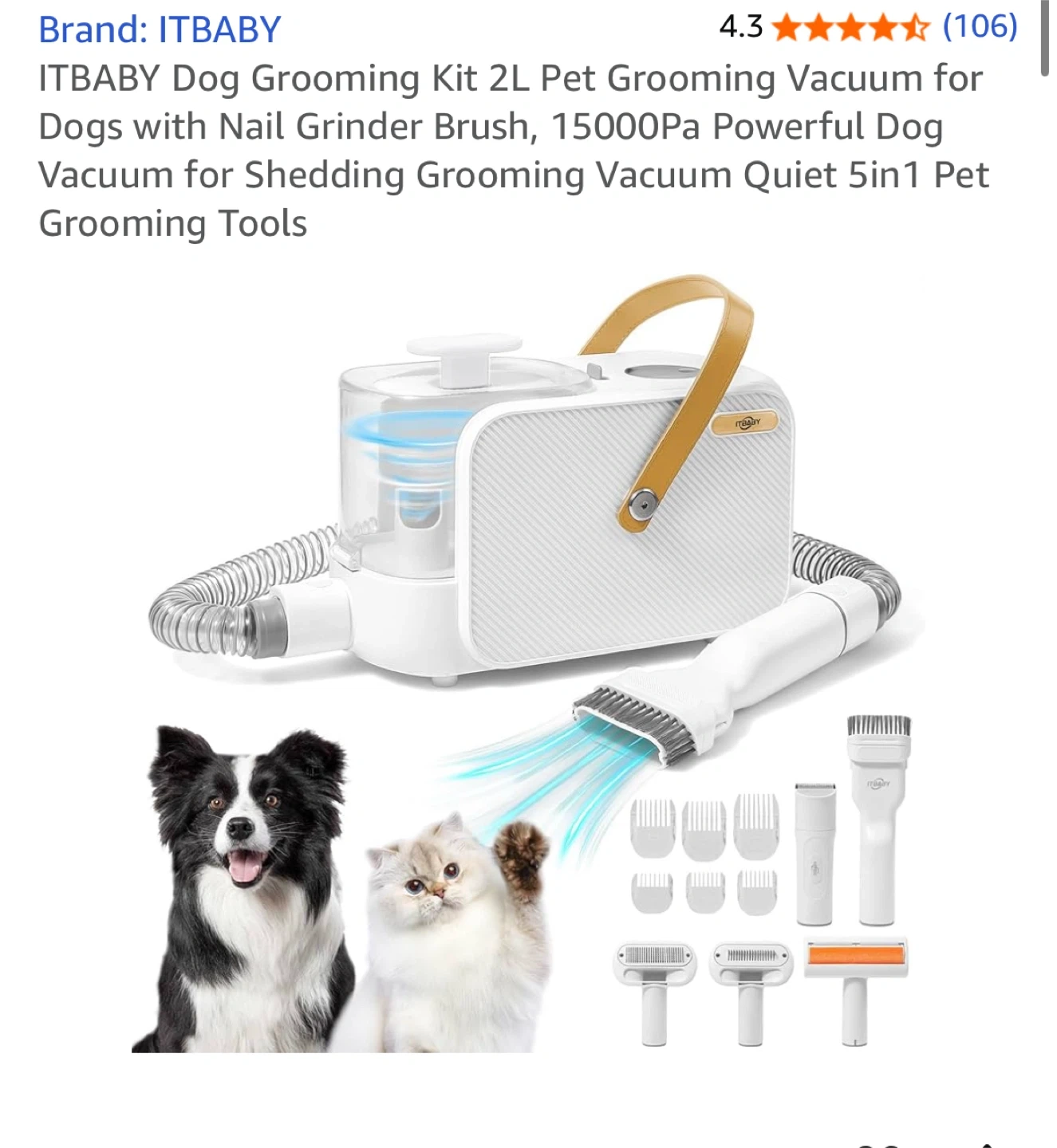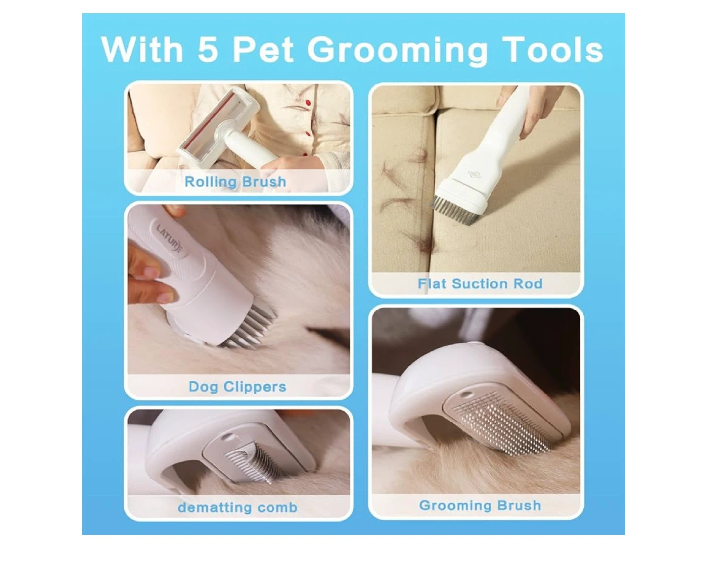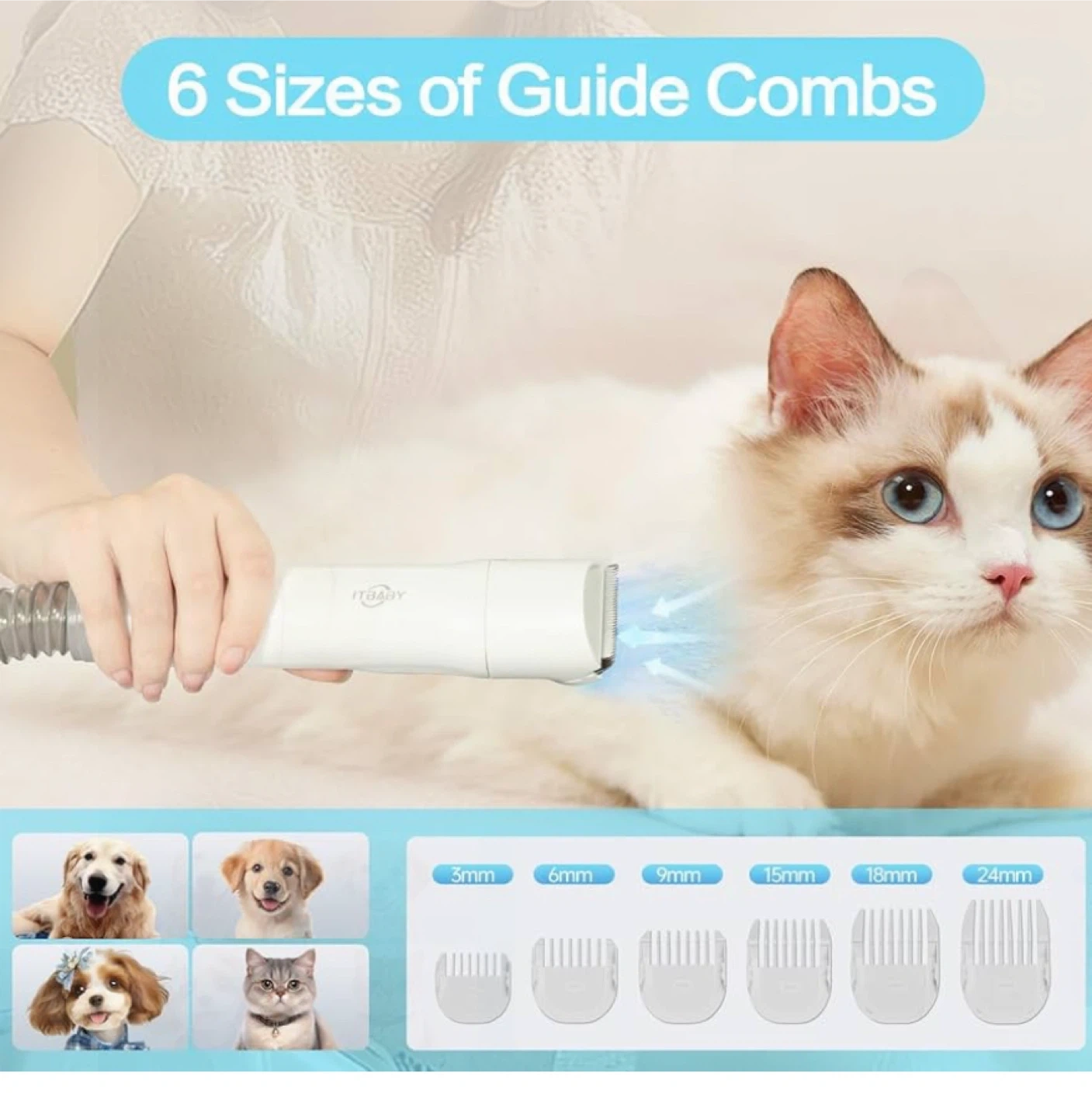Keep your furry friends looking their best with this ITBABY Dog Grooming Kit! This 2L pet grooming vacuum is perfect for dogs with nail grinder brush. It features 15000Pa powerful dog vacuum for shedding grooming and quiet 5in1 pet grooming tools. Comes with 6 sizes of guide combs and 5 pet grooming tools including rolling brush, flat suction rod, dog clippers, dematting comb, and grooming brush