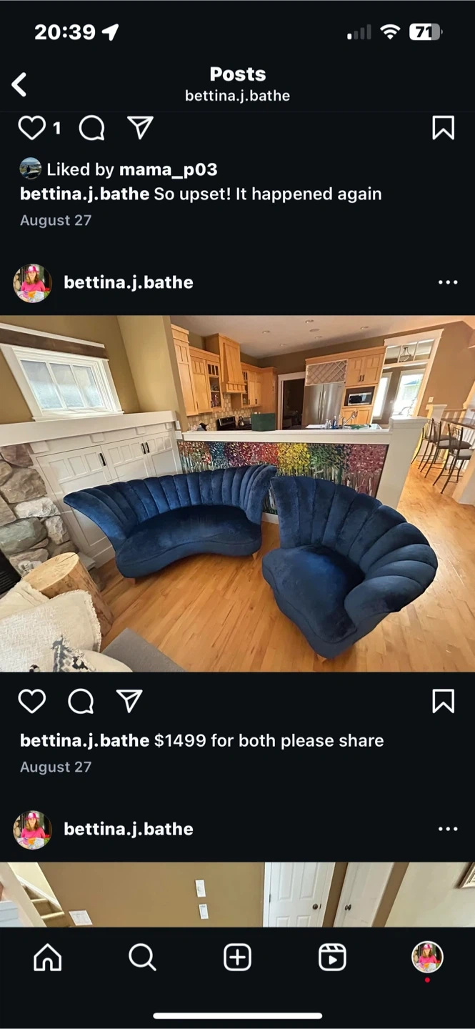 Selling a beautiful blue velvet curved sofa and matching chair. They're in great condition and would add a touch of elegance to any living space. The original listing price was $1499 for the set.