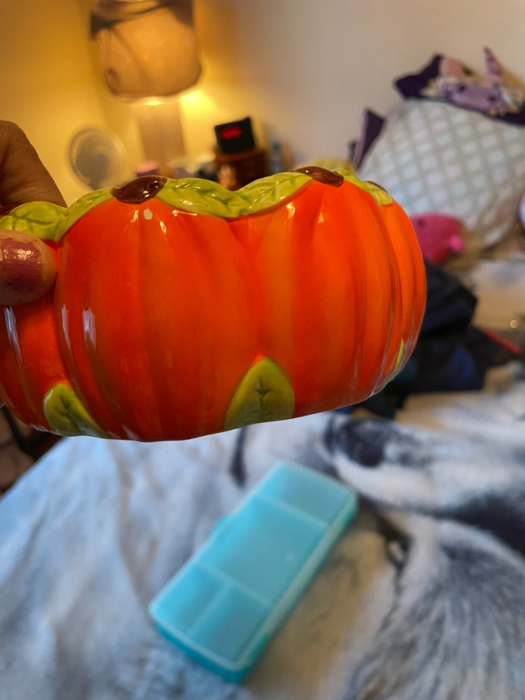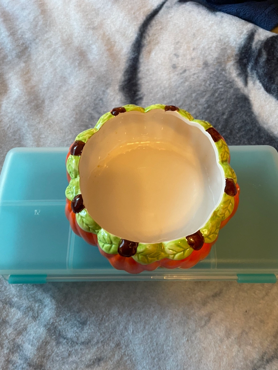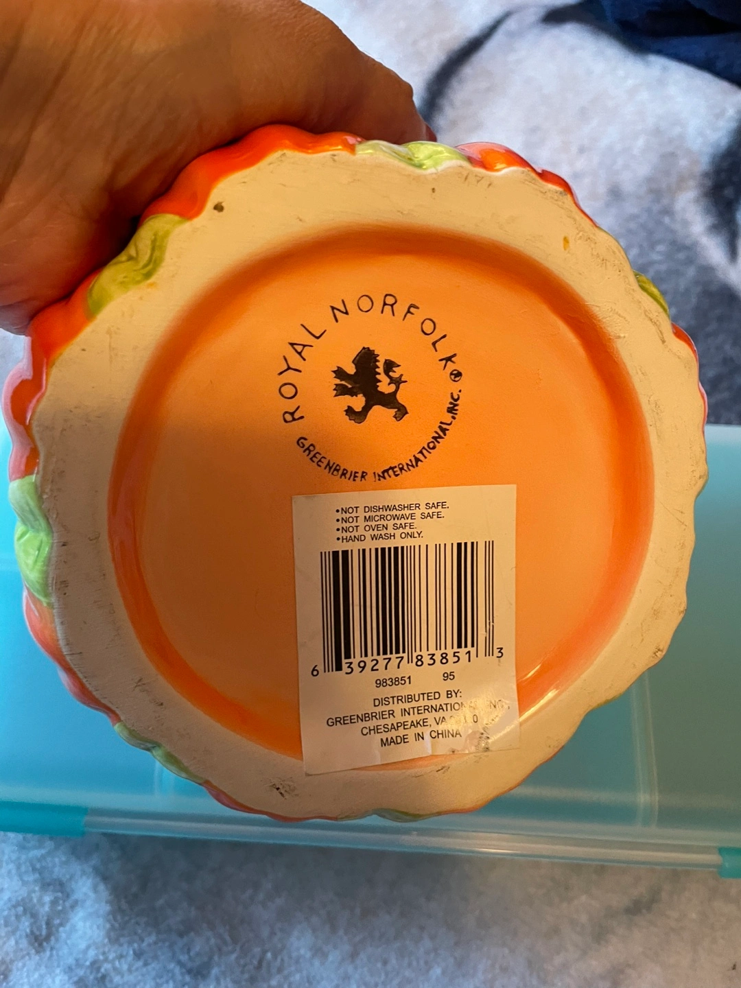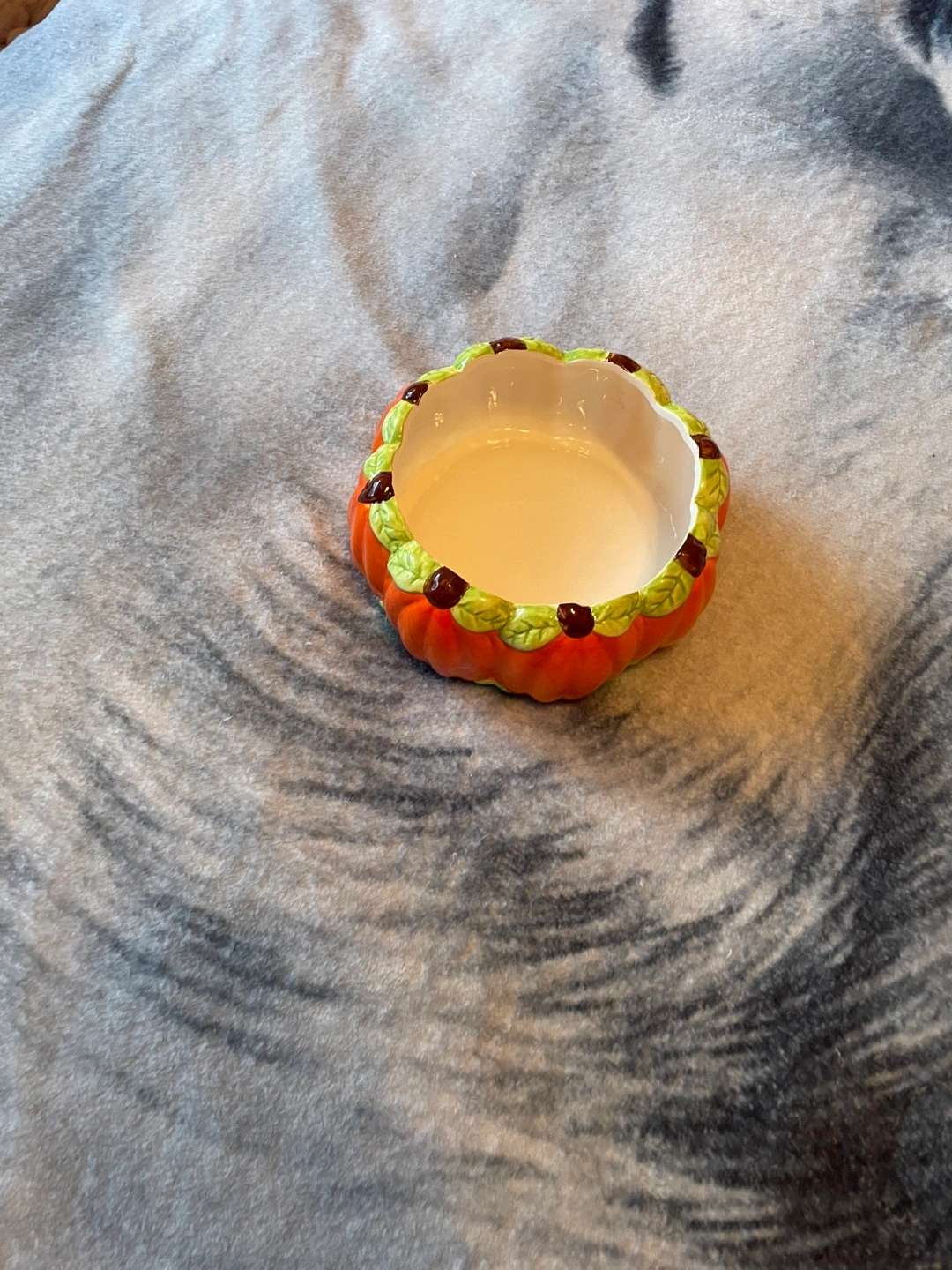 Selling a cute pumpkin-shaped bowl from Royal Norfolk! It's perfect for fall decor or serving snacks. The bowl is in great condition and features a unique design with green leaves and brown accents around the rim. It's hand wash only, so it's easy to care for