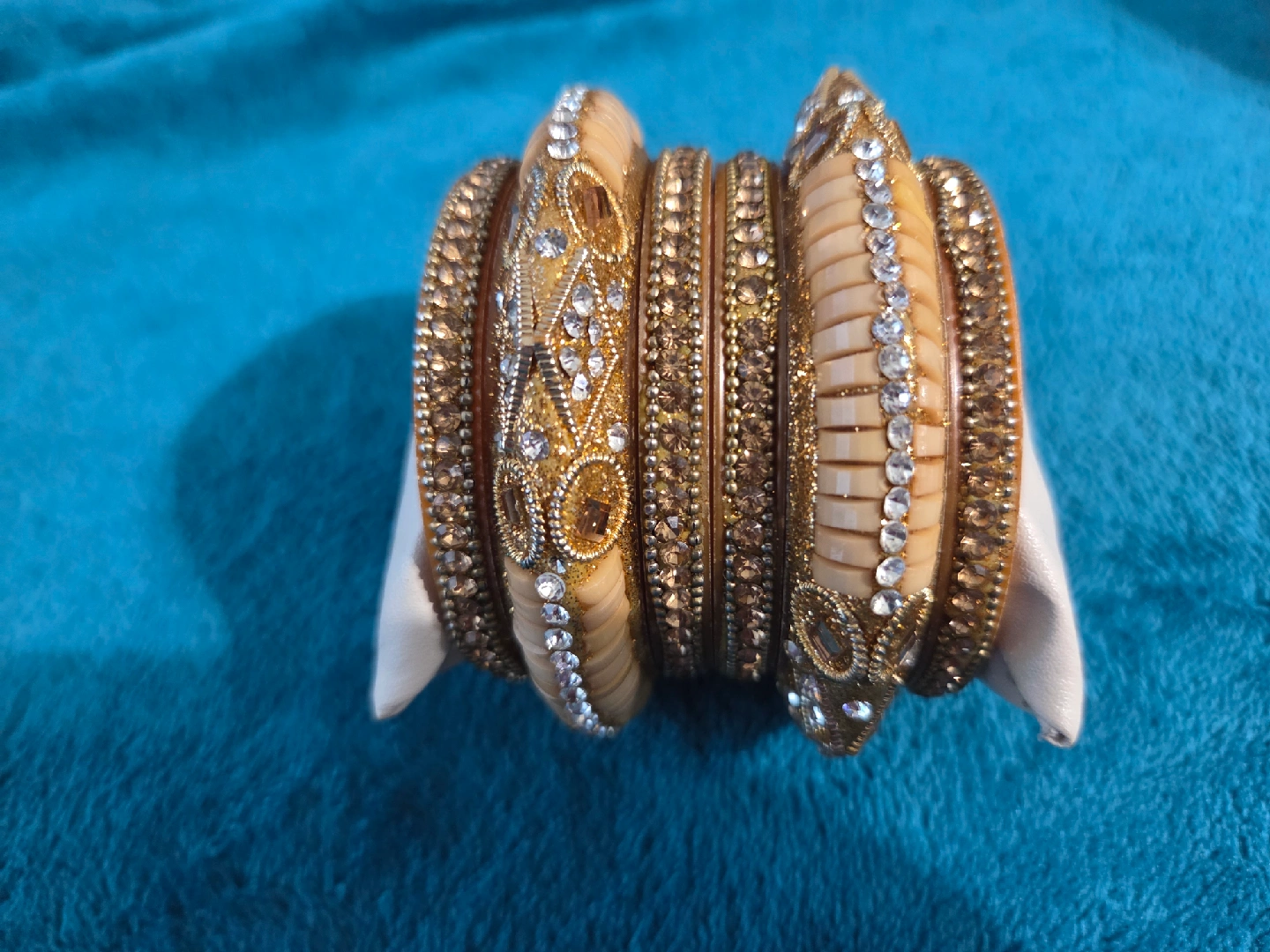 Selling a set of six beautiful bangles in a mix of gold and cream colours. They have intricate detailing with embedded stones. Perfect for adding a touch of elegance to any outfit!