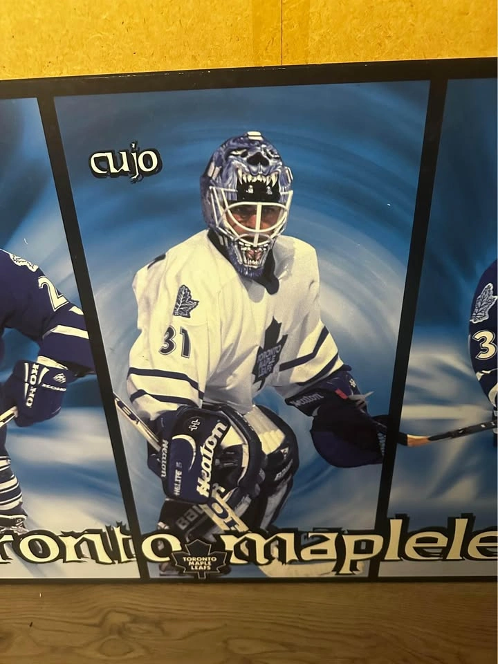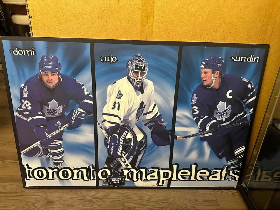 Very rare and beautiful vintage wood mounted Leafs poster. Features the 3 stars from back in the day - Sundin, Cujo and Domi. Has some wear on the front but it's in overall good shape.