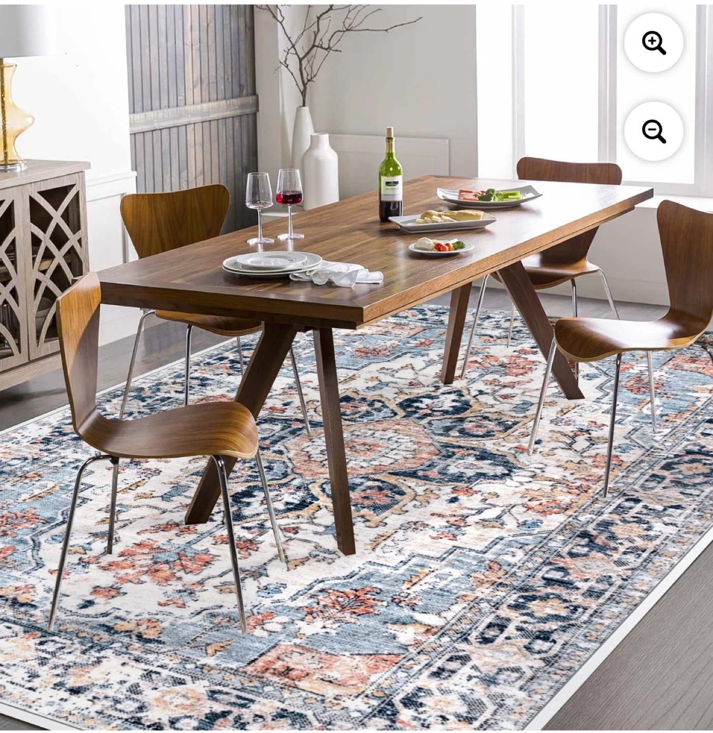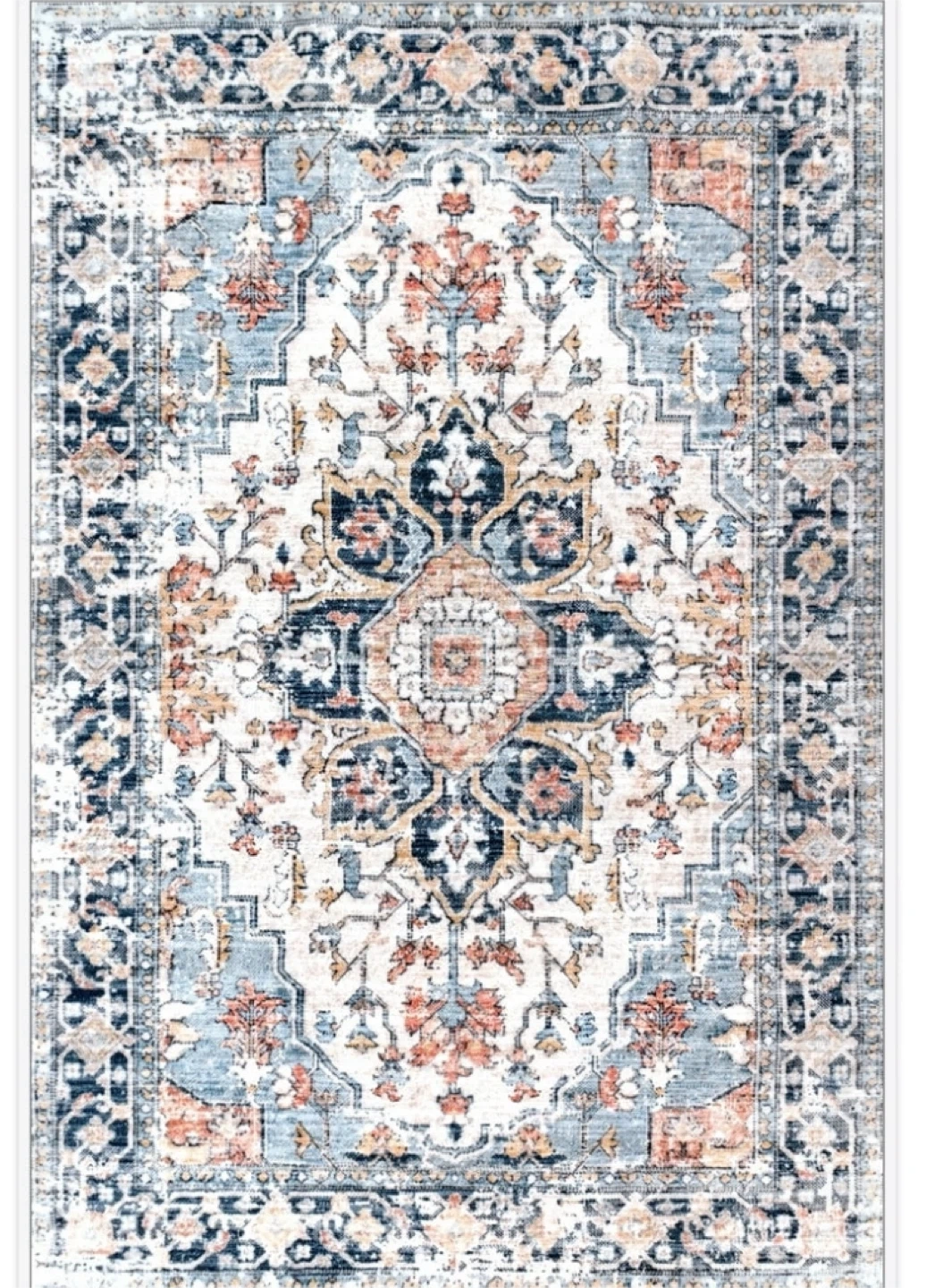 Spruce up any room with this beautiful area rug! It features a lovely blue, orange, and white pattern that would complement a living room, dining room, kitchen, or bedroom. It's in new condition and ready for a new home