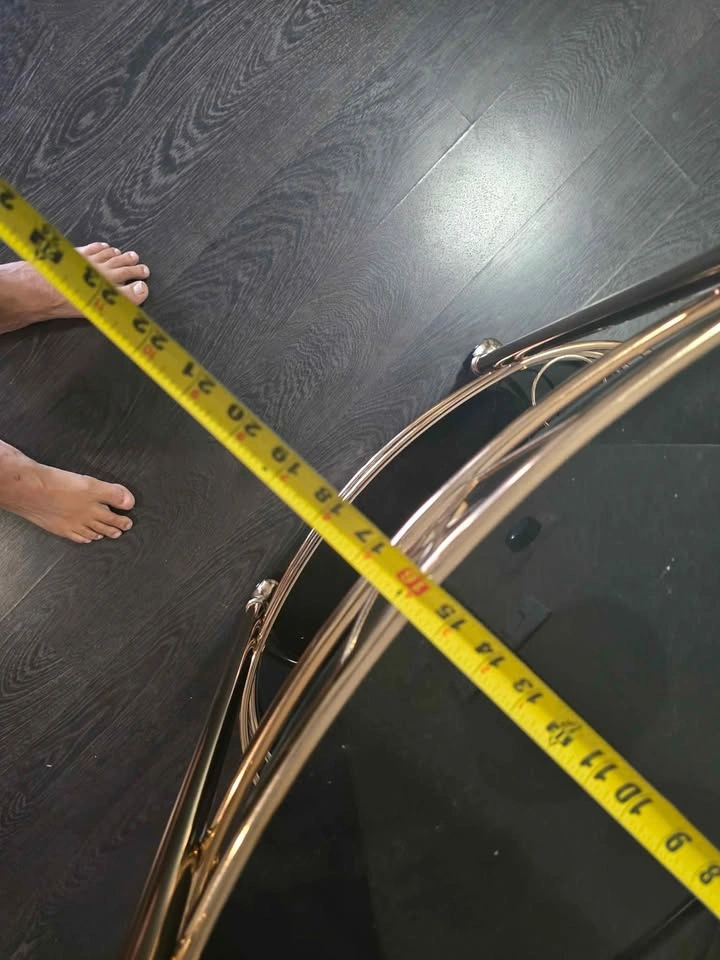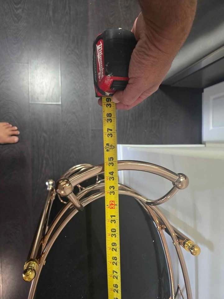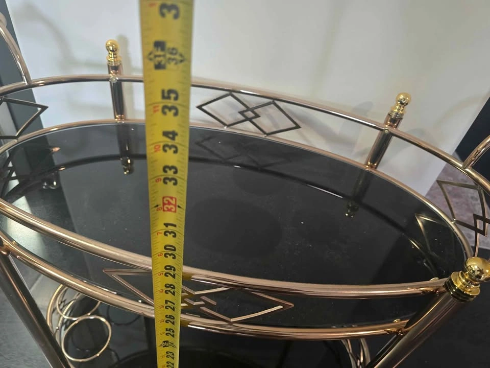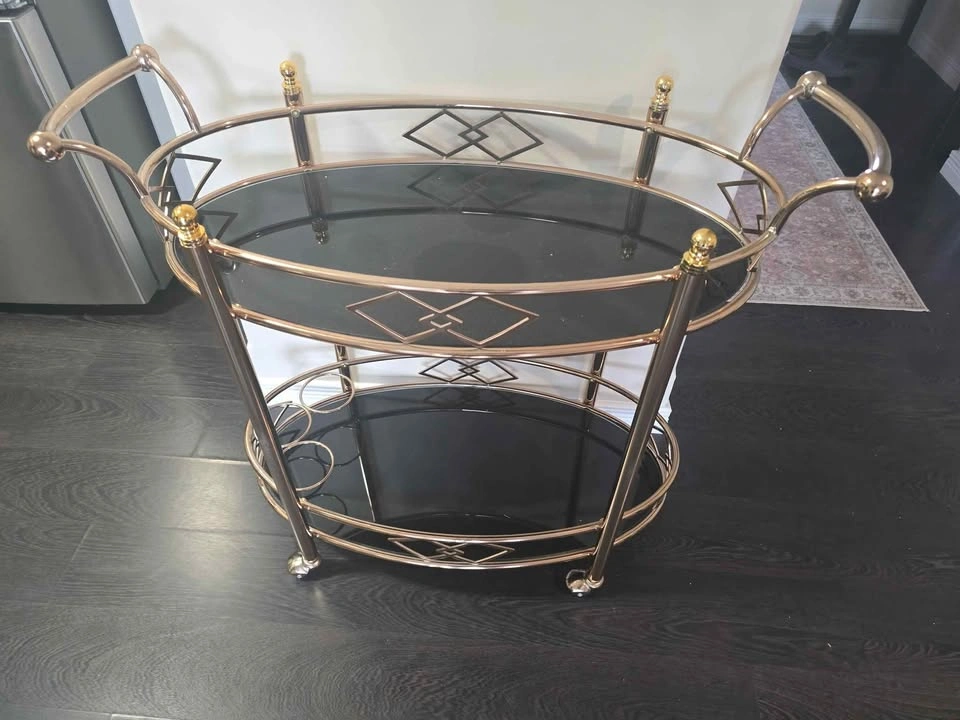 Elevate your home entertaining with this stylish bar cart! This used two-tiered bar cart features a sleek gold frame with elegant black glass shelves, perfect for showcasing your favourite spirits and glassware. It's in good condition, ready to add a touch of glamour to your living space. Specifications: * Two-tier design * Gold finish frame * Black glass shelves * Dimensions: 38" height x 18" diameter