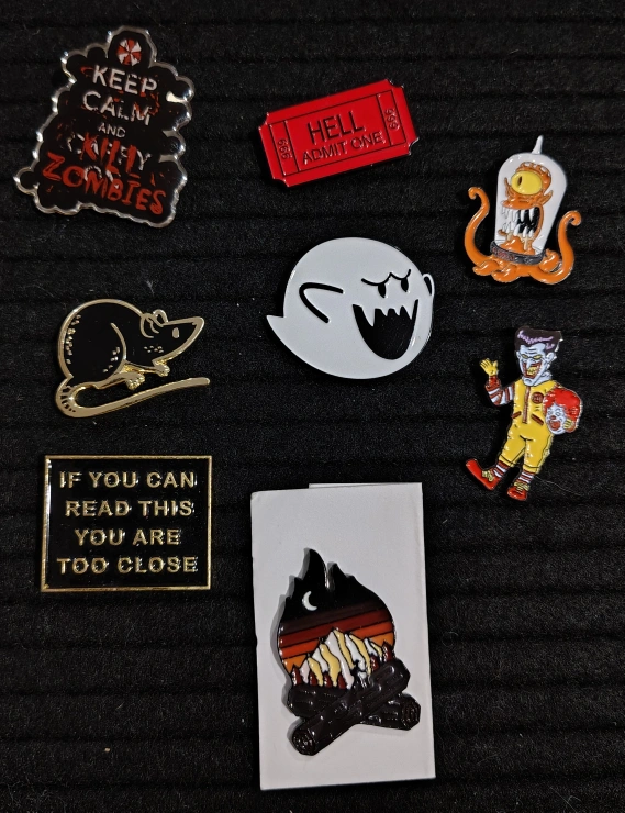 Selling a collection of enamel pins! They include designs like: - Keep Calm and Kill Zombies (resident evil) - Hell Admit One - Boo (from Mario) - If You Can Read This You Are Too Close - Campfire scene - Joker dressed as Ronald McDonald -Alien from the Simpsons -Golden rat all brand new and detailed enamel, selling together as a bundle for 60!