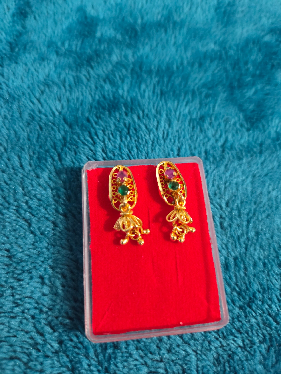 These are a pair of earrings with gold-coloured metal and small coloured stones. They come in a clear plastic box with a red insert