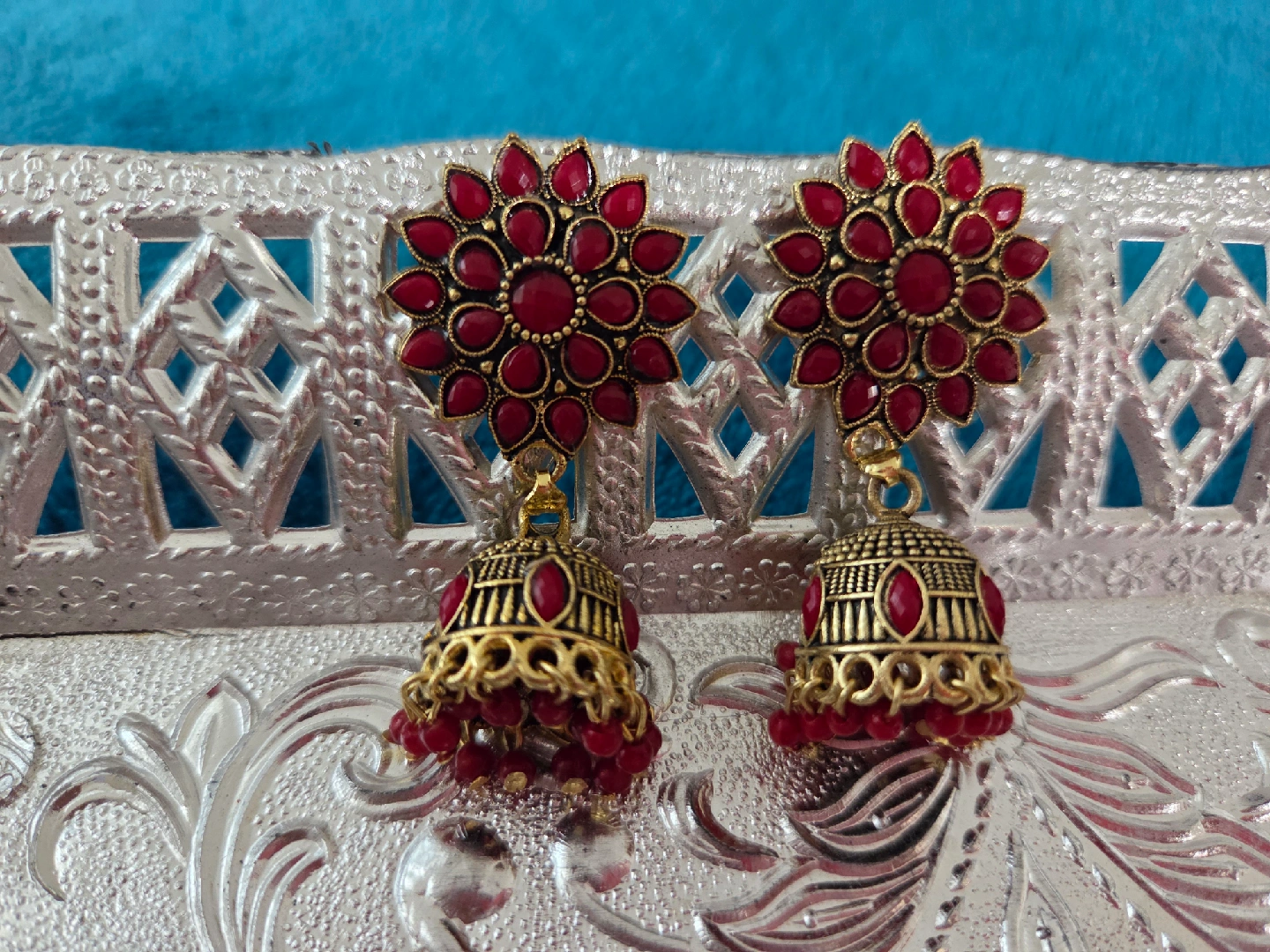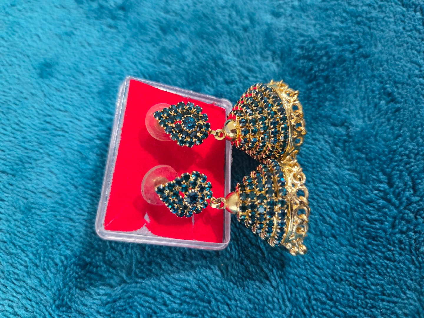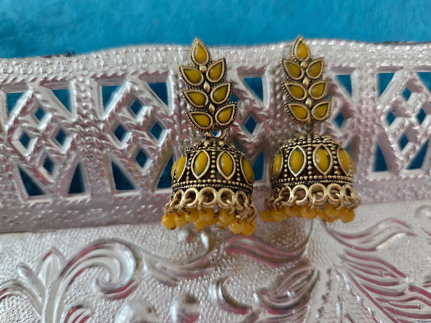 Selling a set of three pairs of jhumka earrings. There's a pair in yellow, blue, and red. They are in great condition and ready for a new home