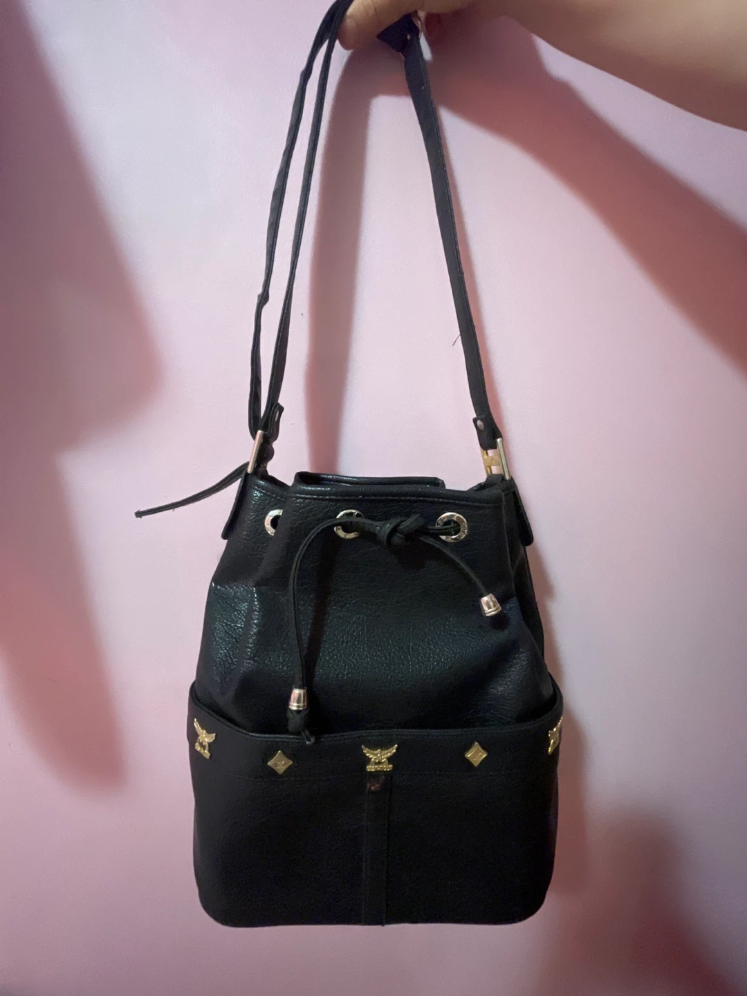 Selling a stylish MCM black leather bucket bag! It's in great condition and features the classic MCM logo detailing. Perfect for everyday use or a night out. It has a drawstring closure and adjustable shoulder strap.