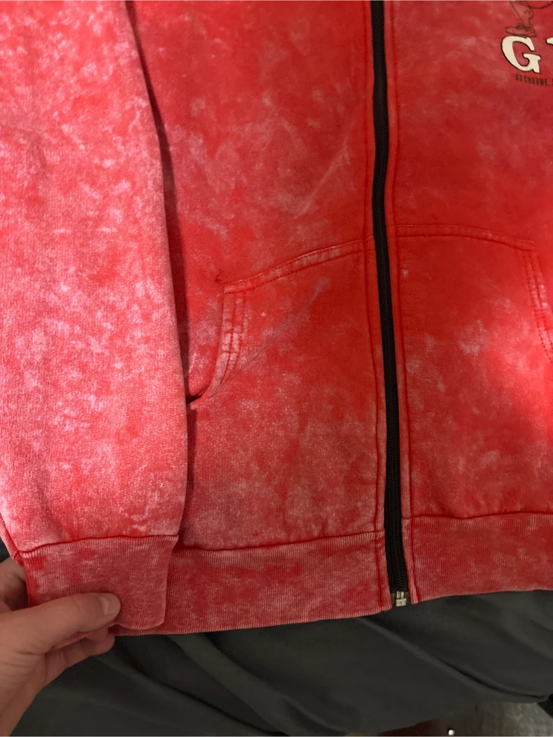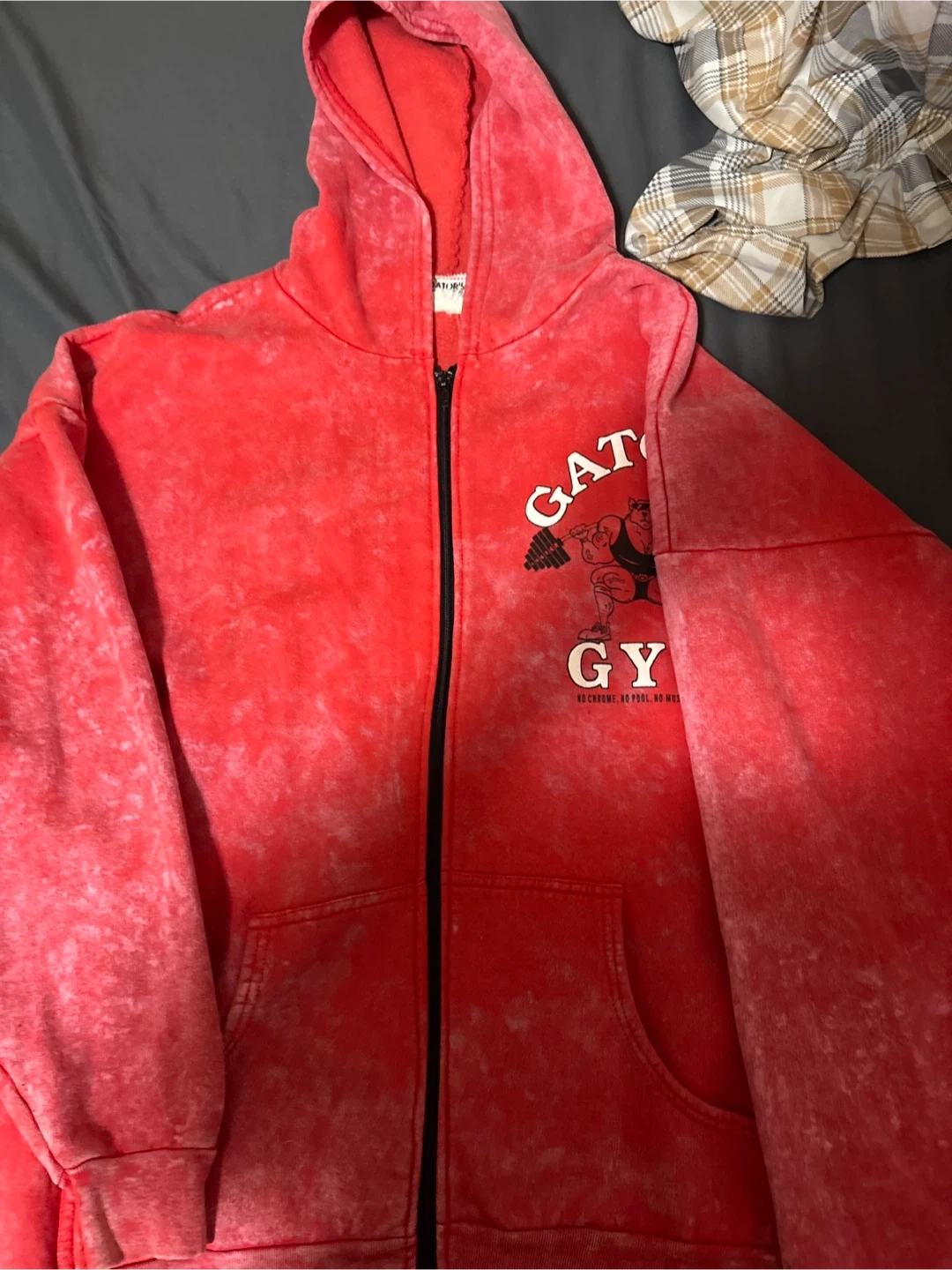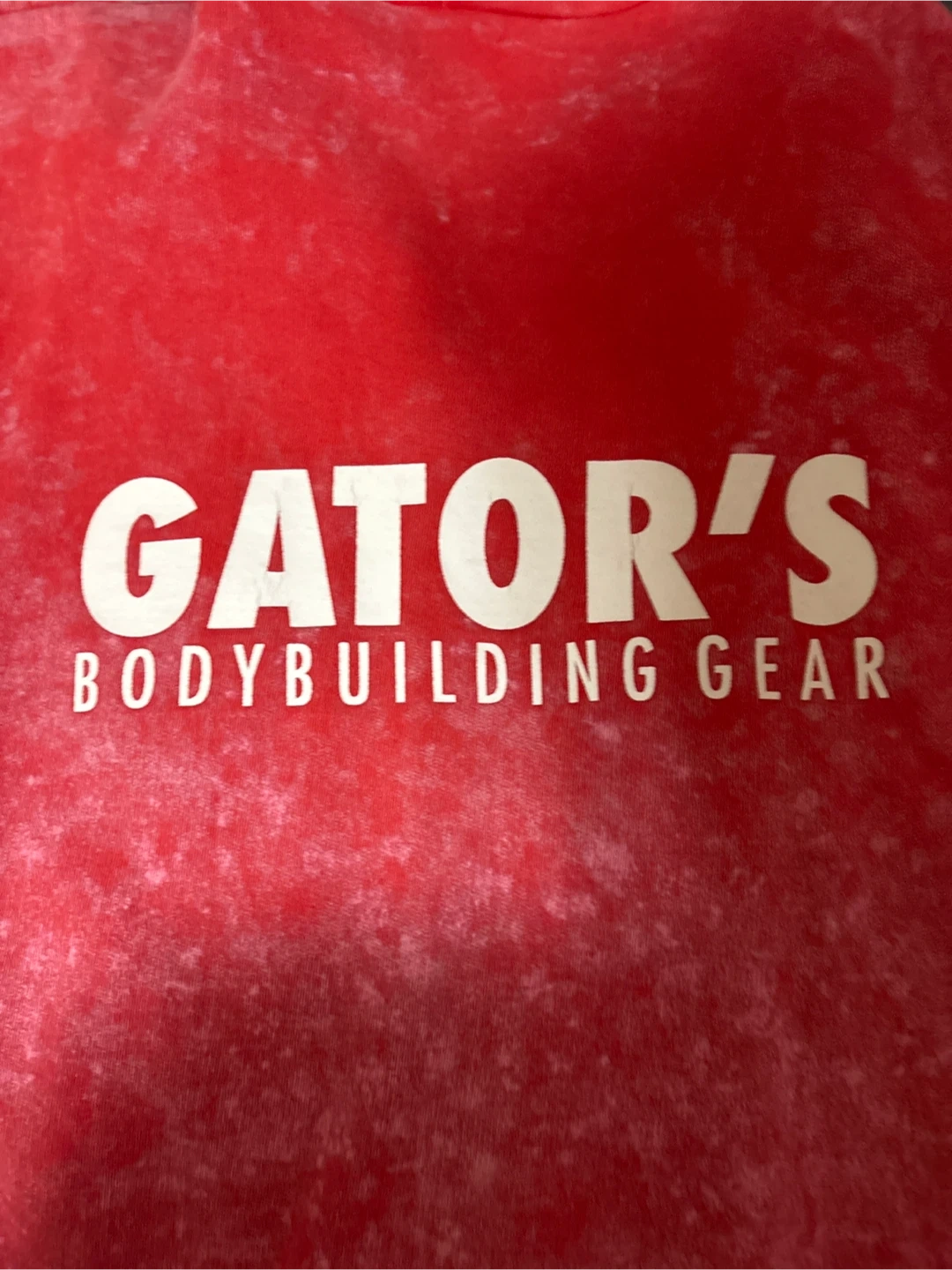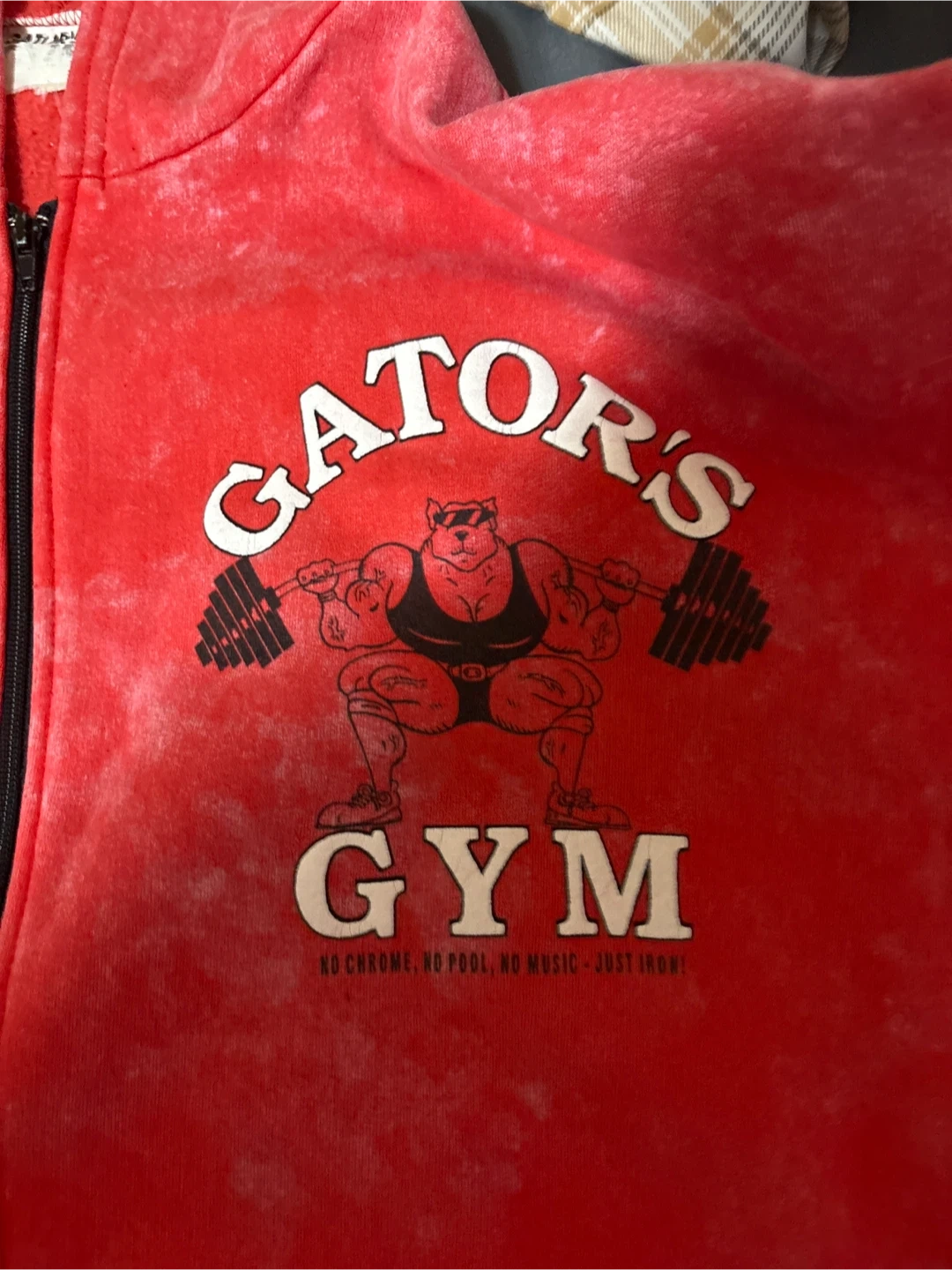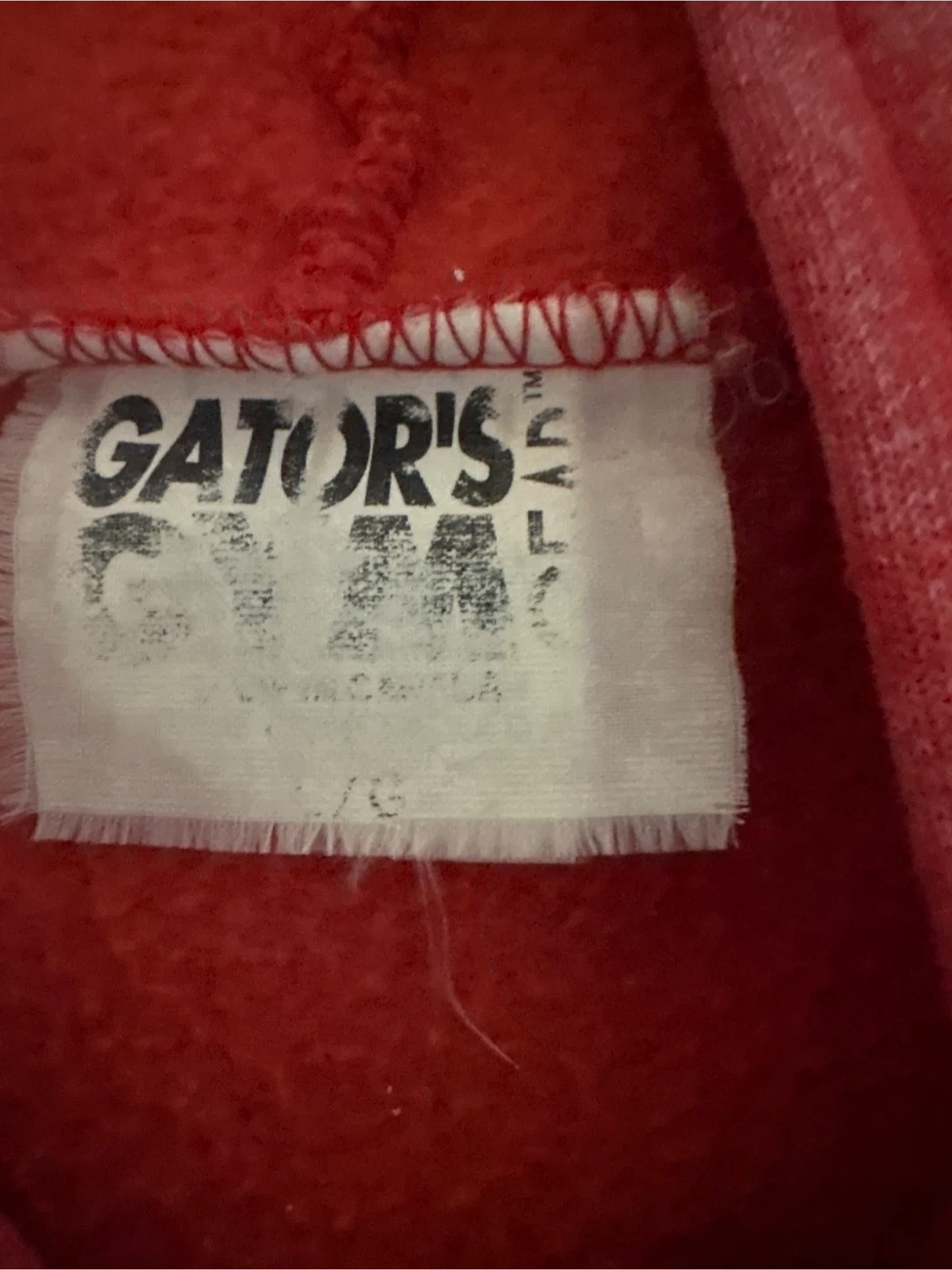 Selling a Gator's Gym hoodie in red! It's a size large and has a cool, faded look. Perfect for the gym or just lounging around. The hoodie features the Gator's Gym logo and is in good condition.
