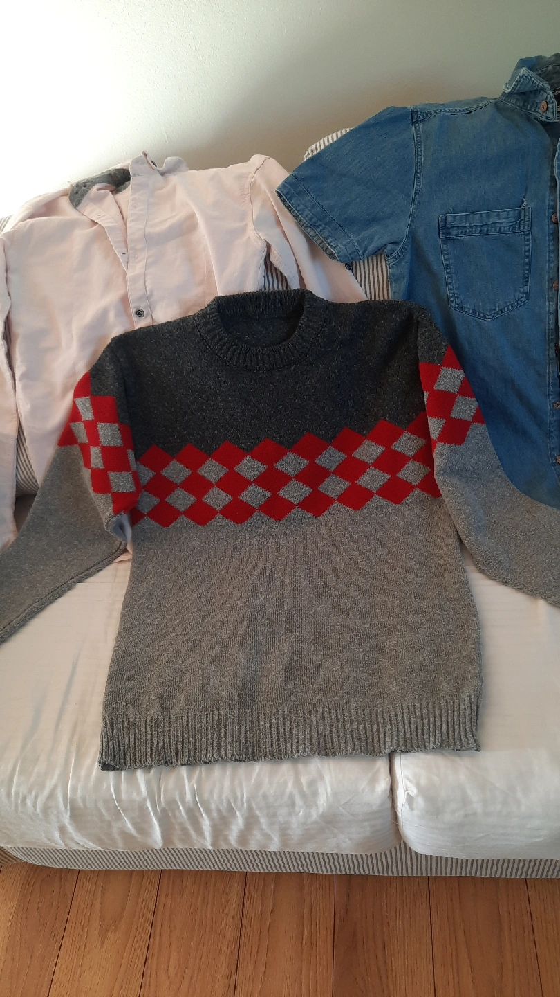 Cozy sweater with a unique grey and red diamond pattern. Perfect for adding a touch of style to your wardrobe!