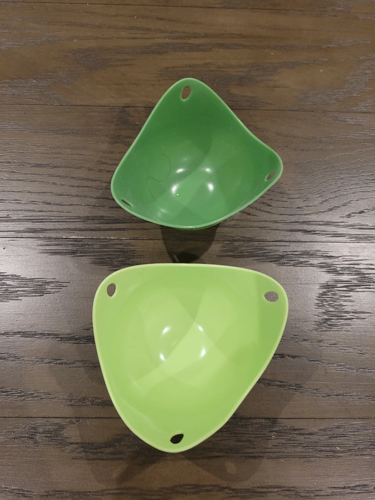 New Silicone Egg Poaching Cups - Set of 2 Selling a set of two silicone egg poaching cups! They're in great condition and make poaching eggs super easy. One is green and the other is a lighter green colour. Perfect for making breakfast!