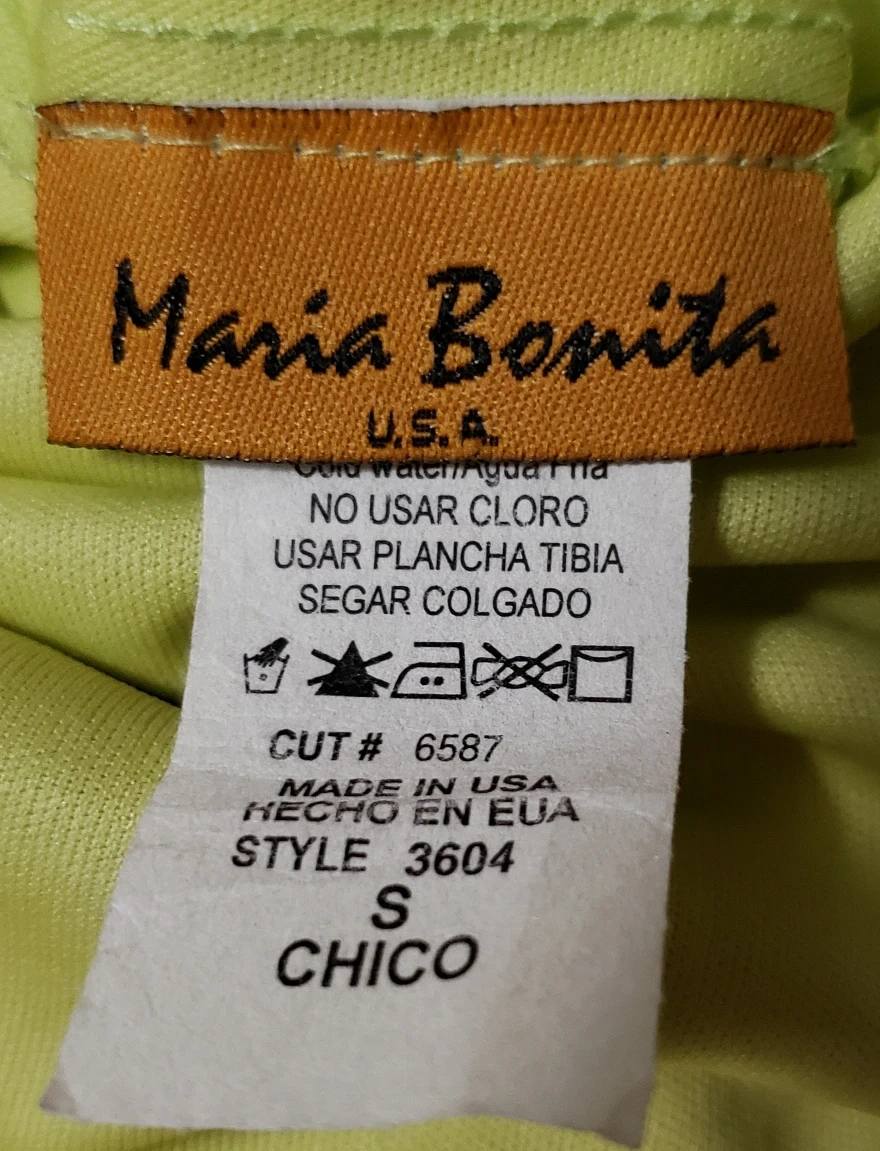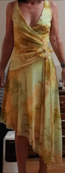 Selling a gently used Maria Bonita dress in size small. It features a unique yellow and orange pattern, perfect for a special occasion or a night out. The dress has a stylish asymmetrical hemline and a lovely floral detail at the waist. Purchased at YaYa. The price is negotiable within reason.