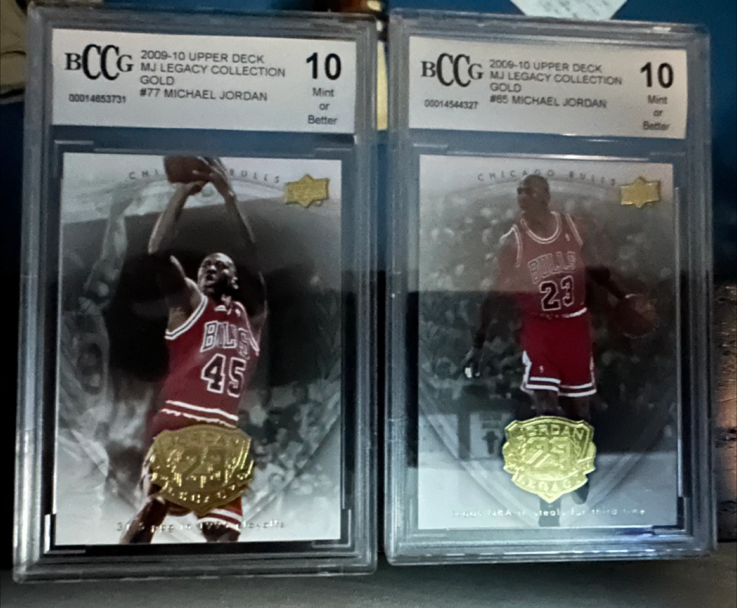 2009-2010 Upper Deck MJ Legacy Collection # 77 and # 65. Both BCCG graded 10. I considered trying a PSA crossover grading but wait times and cost is too high. Take advantage of these 2 Mint Jordan Upper Deckers. The current volatility of the card market could see these skyrocket. $100 for the pair. Can meet anywhere in the GTA. Buy from a trusted seller.