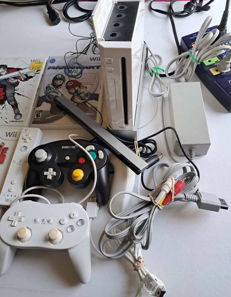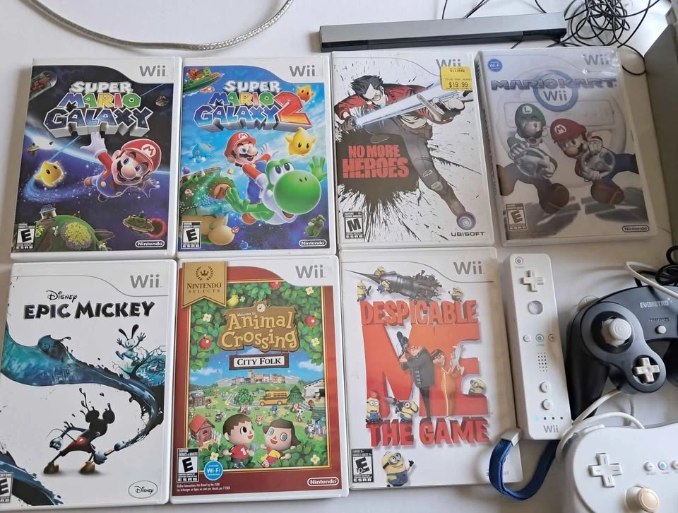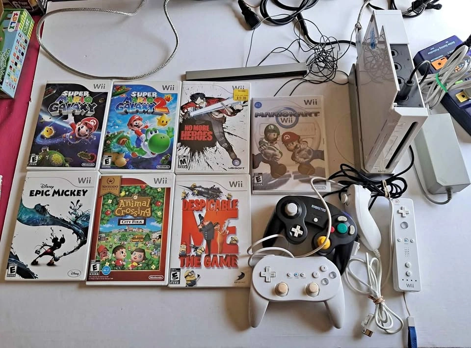 Comes with the following: 1 Wii console 1 sensor bar 1 power cord 1 Wii remote 1 nunchuk 1 GameCube controller 1 Wii controller 7 games: Mario Galaxy, Mario Galaxy 2, No More Heroes, Mario Kart, Epic Mickey, Animal Crossing, Despicable Me Wii Bundle 3