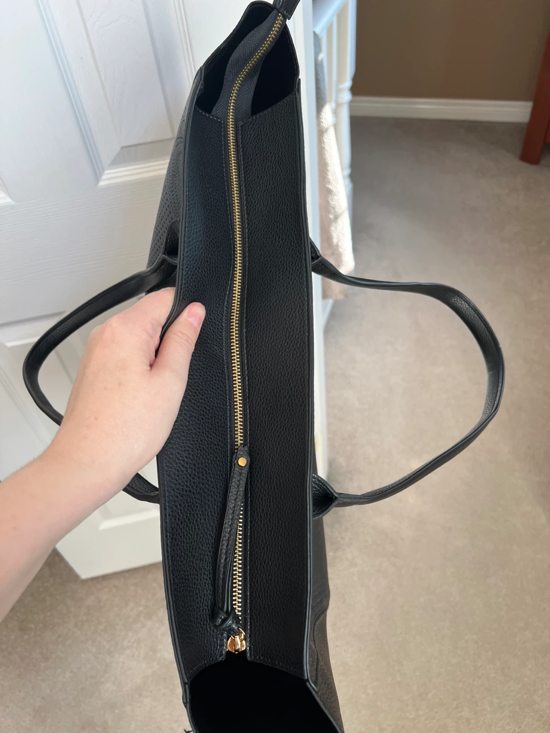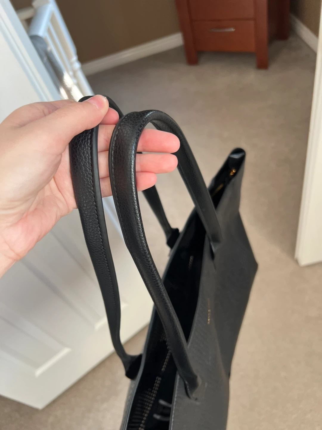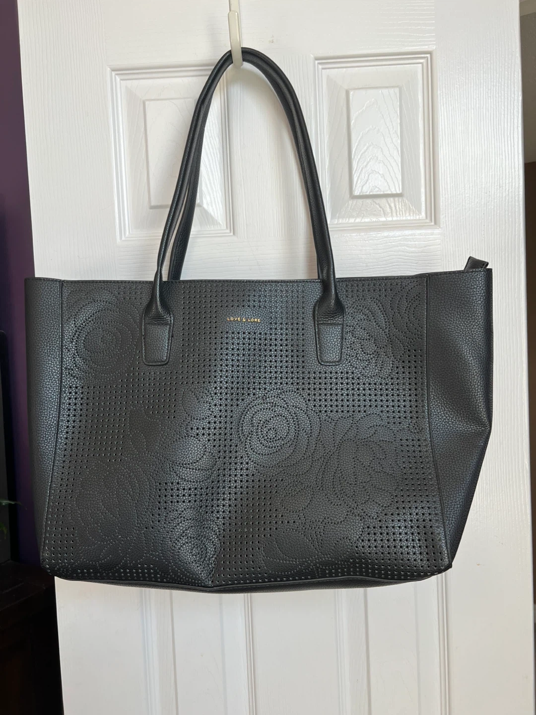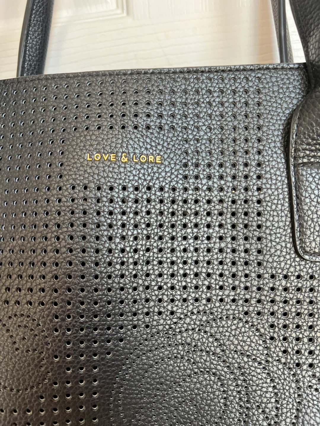 A stylish black tote bag from Love & Lore! It features a unique perforated design and is perfect for carrying your everyday essentials. The bag has a zipper closure and is in great condition!