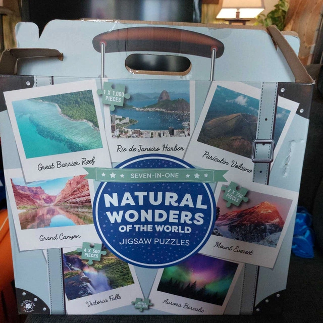 Explore the world's wonders with this 'Natural Wonders of the World' jigsaw puzzle set, featuring seven-in-one puzzles showcasing breathtaking landscapes. This set includes one 1000-piece puzzle, two 750-piece puzzles, and four 500-piece puzzles, perfect for puzzle enthusiasts of all skill levels. Pre-owned with no peices missing from he last time they were put together. * 1 x 1000 pieces * 2 x 750 pieces * 4 x 500 pieces Unbox the adventure and piece together iconic scenes from around the globe. If the ad is up, the puzzles are ready for their next journey!