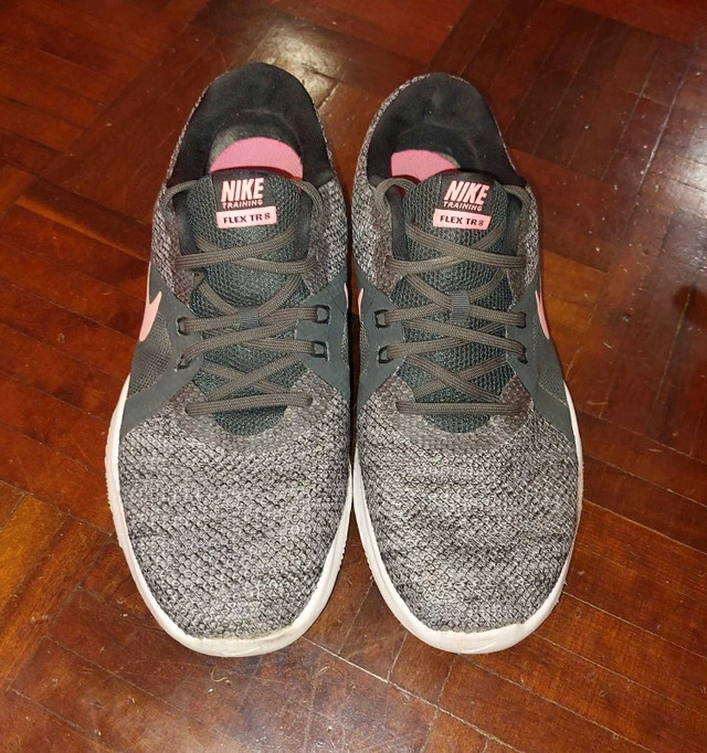 PU: CARLTON/SHERBOURNE AREA Get ready to elevate your training with these Nike Flex TR 8 women's training shoes, size 9.5! These sneakers are designed to offer flexibility and support during your workouts. These shoes have been worn, showing some signs of use, but they still have plenty of life and performance left in them. Ideal for gym sessions, running, or just adding a sporty touch to your everyday look. * Brand: Nike * Model: Flex TR 8 * Size: 9.5 (US Women's) * Color: Grey/Pink * Style: Training Shoes Looking to give these comfy shoes a new home. If you're seeing this ad, yep, they're still available!