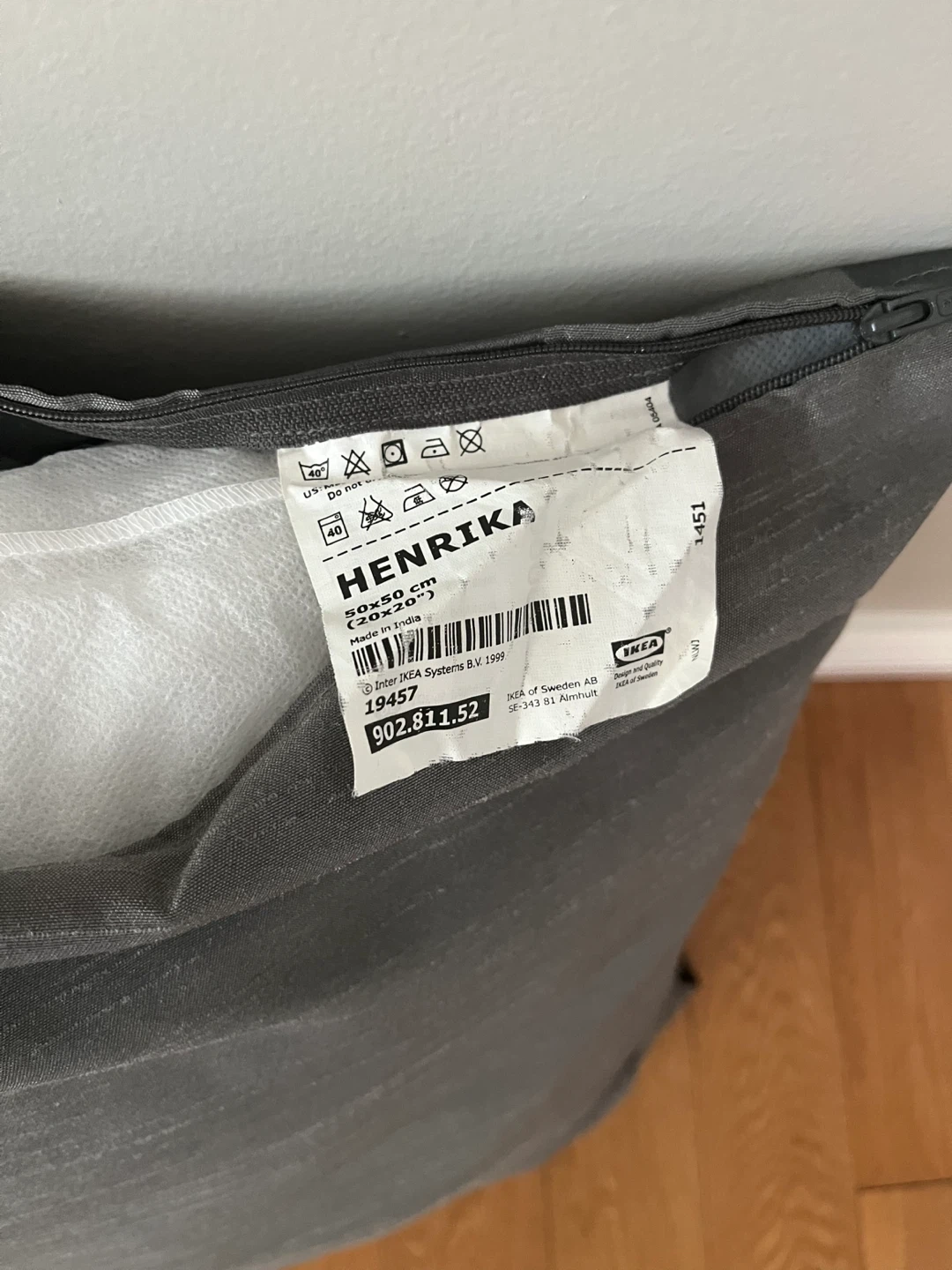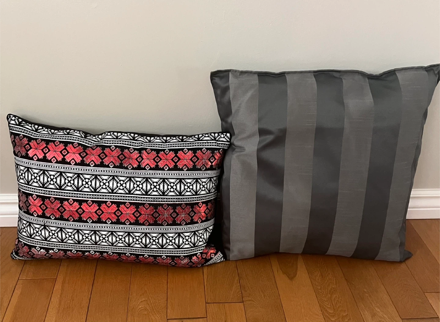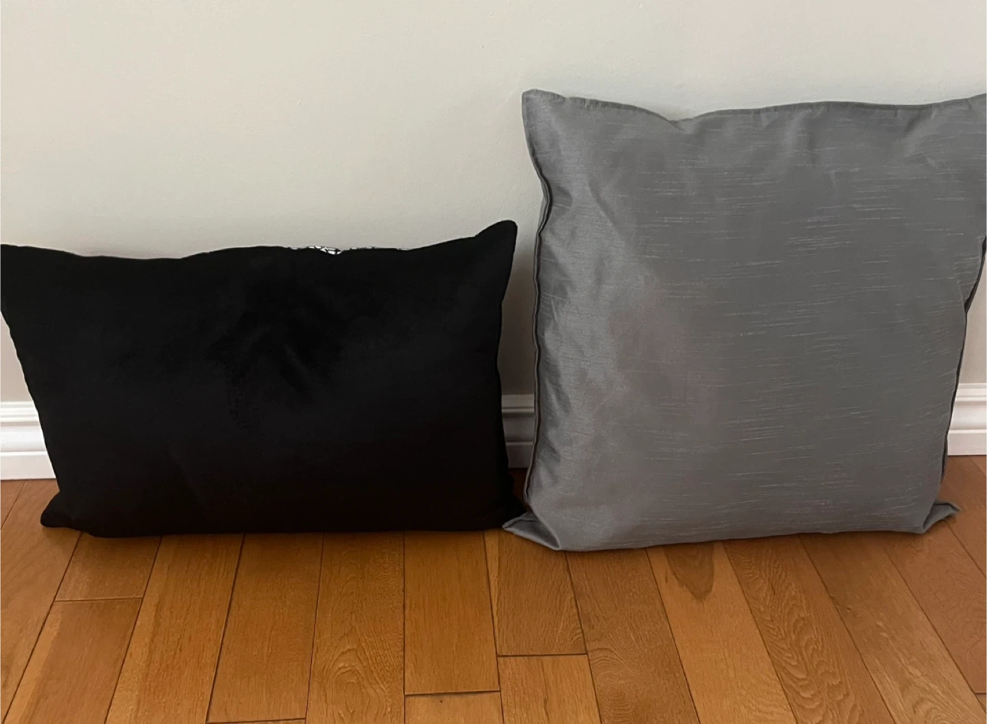 Selling two throw pillows. One is a lovely black with a red pattern that measures 20”x13” and the other is a sleek grey from IKEA that measure 50x50cm (20x20"). Price is for both