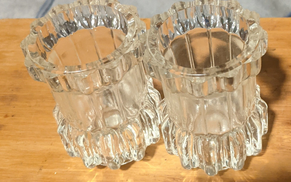 Selling a pair of clear glass candle holders! They're in great shape and ready to add a touch of sparkle to your space. Perfect for tea lights or votives, these little holders are super versatile and easy to style