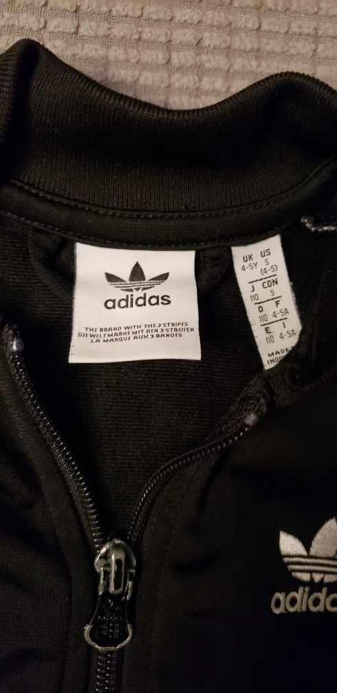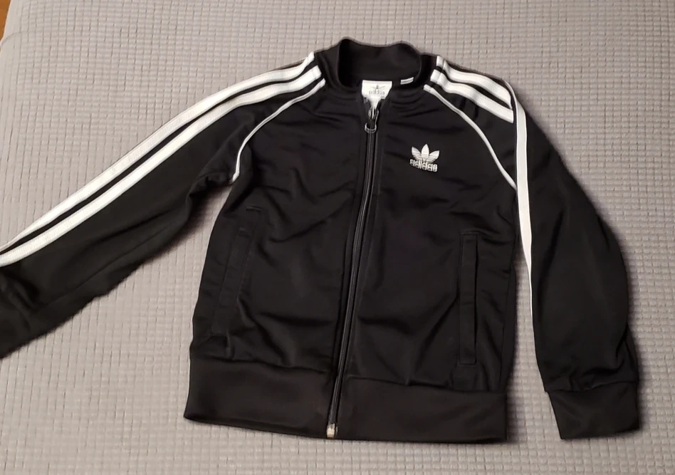 Selling a cute Adidas track jacket for kids! It's black with the classic white stripes on the sleeves. The size is 4-5 years (US size).