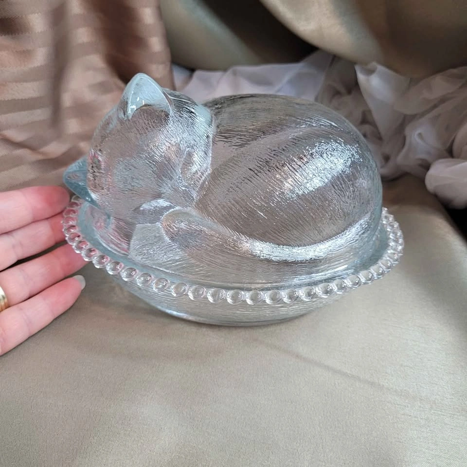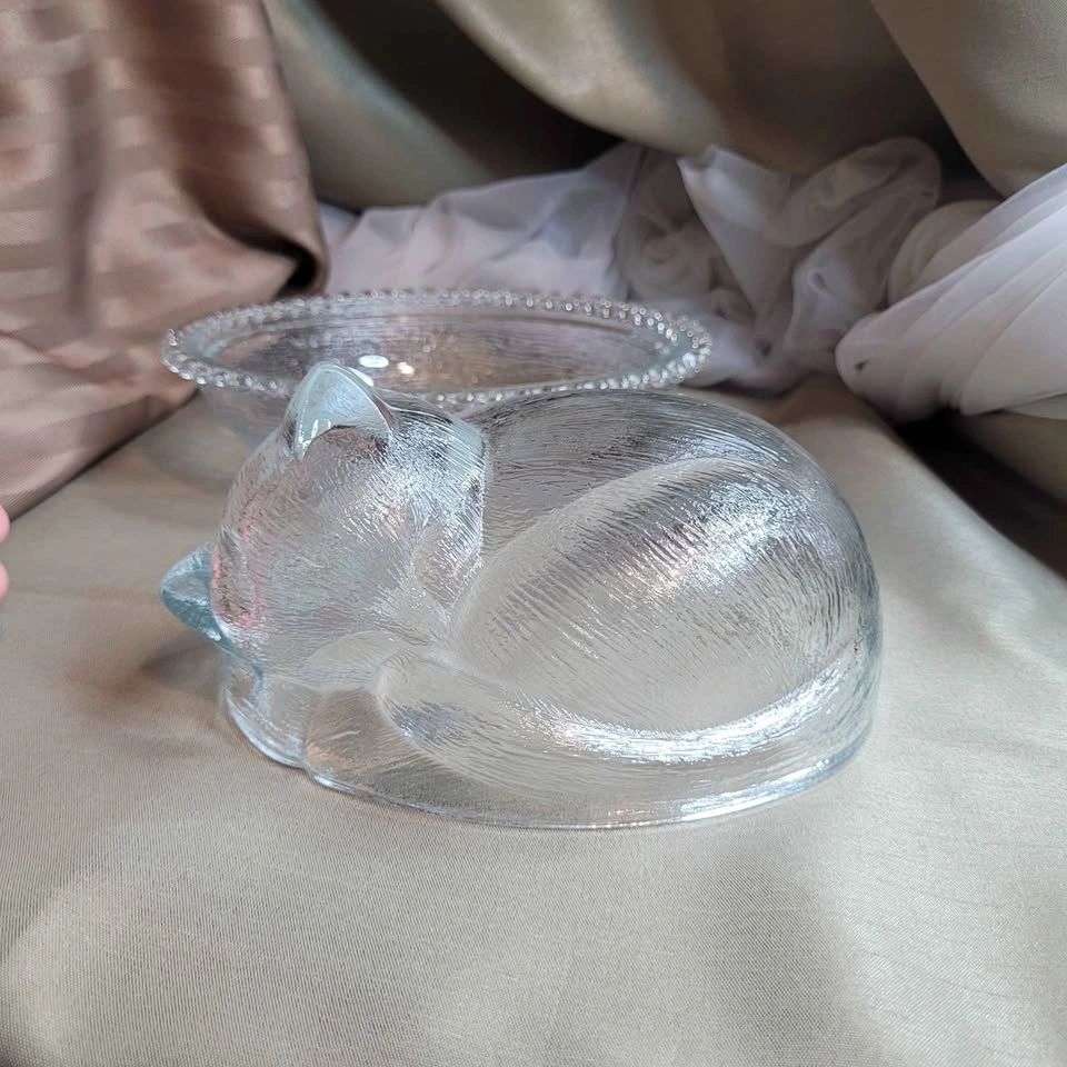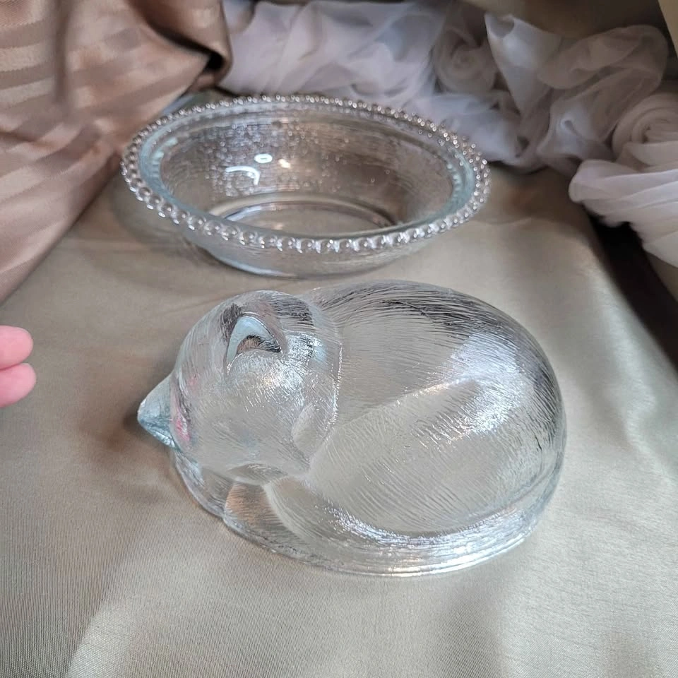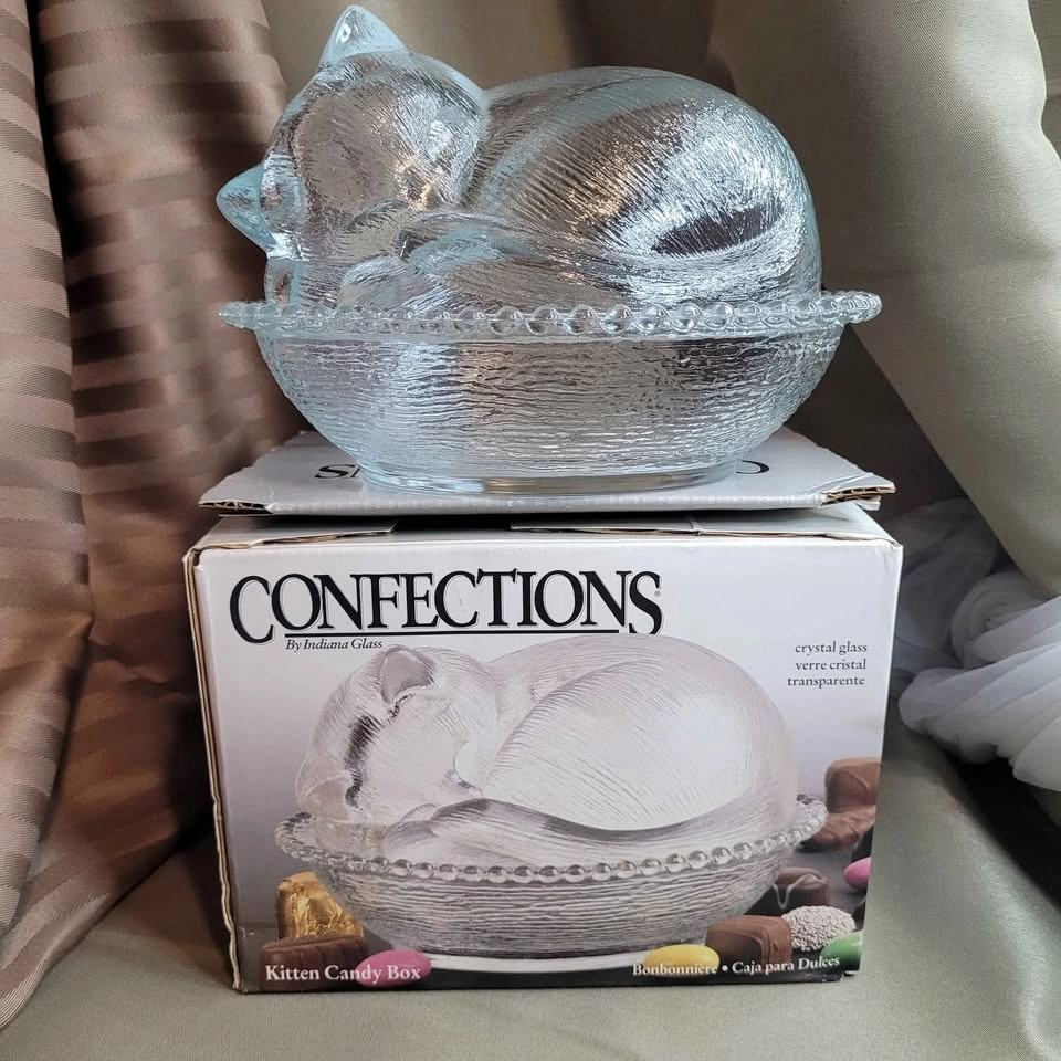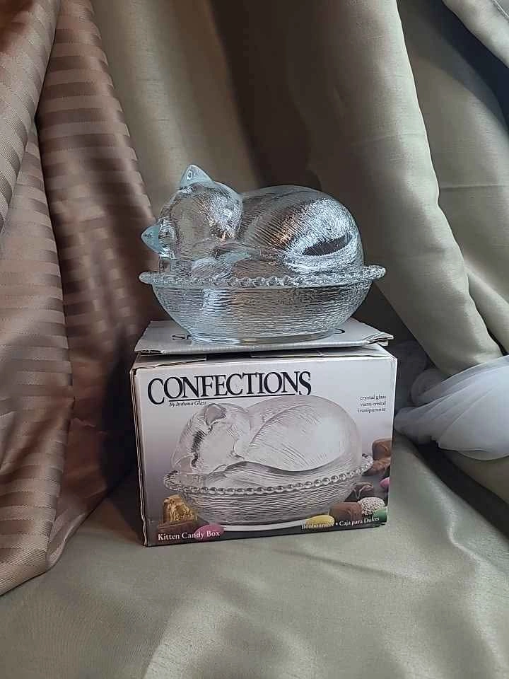 Beautiful Vintage Sleeping Kitten Crystal Indiana 2pc Glass Candy Dish with Original Box 7" x 6" x 5" No chips No cracks Please see all pictures. Located in Bradford, May be able to Meet. Please contact me for more Info & to make arrangements, sorry no holds without an ET. Thank you so much for Looking!
