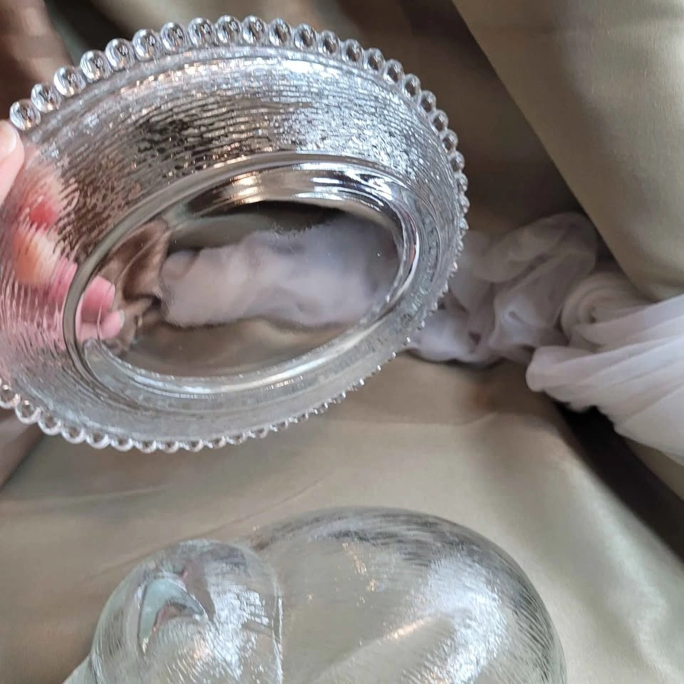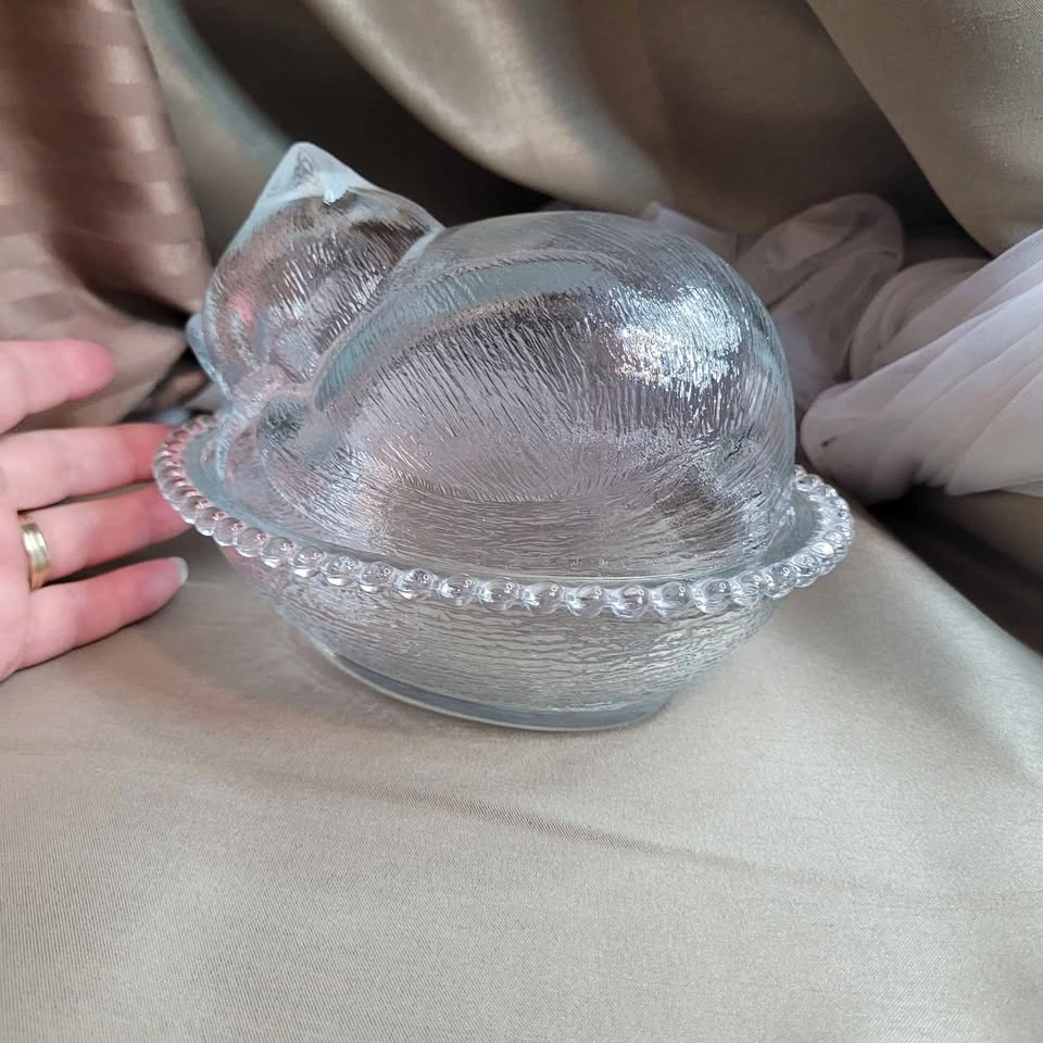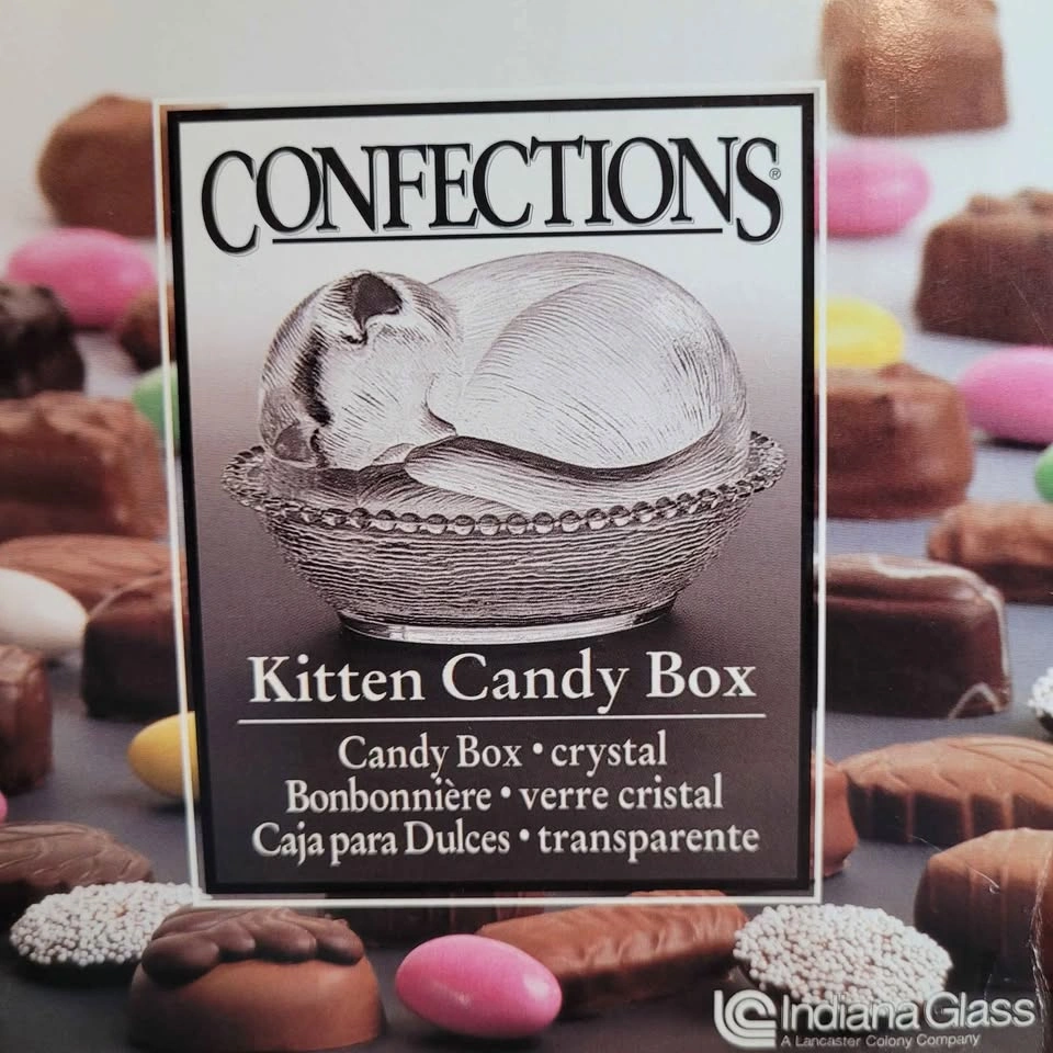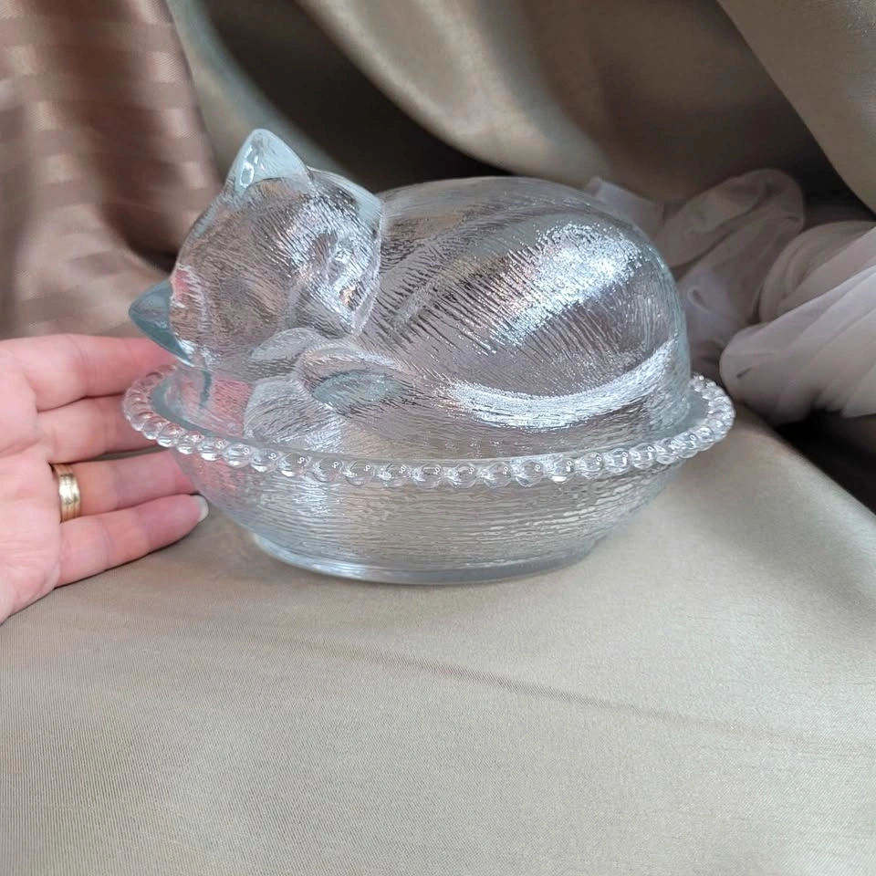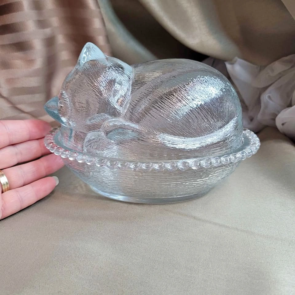 Beautiful Vintage Sleeping Kitten Crystal Indiana 2pc Glass Candy Dish with Original Box 7" x 6" x 5" No chips No cracks Please see all pictures. Located in Bradford, May be able to Meet. Please contact me for more Info & to make arrangements, sorry no holds without an ET. Thank you so much for Looking!