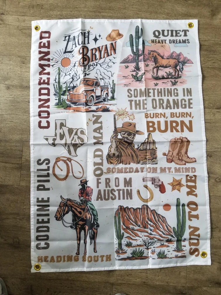 Spice up your space with this unique flag featuring designs inspired by Zach Bryan's music and themes! Perfect for adding a touch of country and western vibes to any room or as a cool addition to your collection. Brand new approximately 34x24