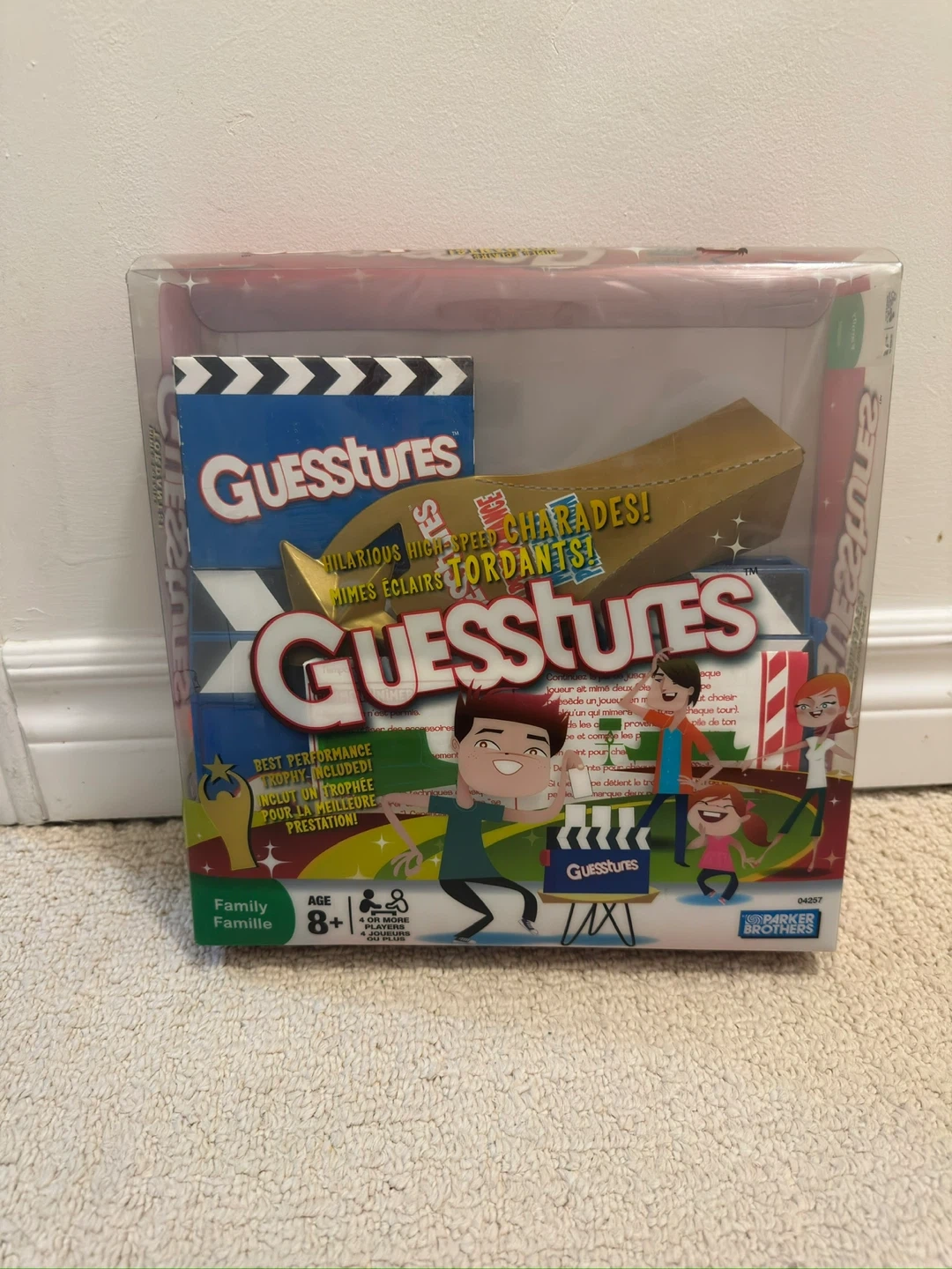 Get ready for some hilarious high-speed charades with GuessTures! This family game is perfect for ages 8 and up, and includes a best performance trophy for the ultimate winner! The box is in great condition and ready for a new family to enjoy