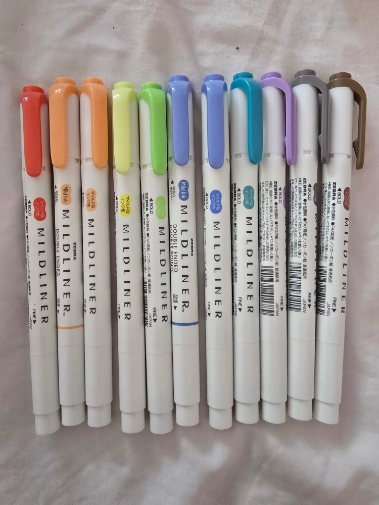 11 mildliner highlighters (some duplicate colours). Great for journaling or school! Pickup at Main St & Kingston Rd or drop off on TTC line 2 on Fridays only. โ๏ธ Discounts will be given if you bundle multiple items โ๏ธ ๐ Open to trading for: stationary, books, Hello Kitty/Miffy/Kpop items ๐