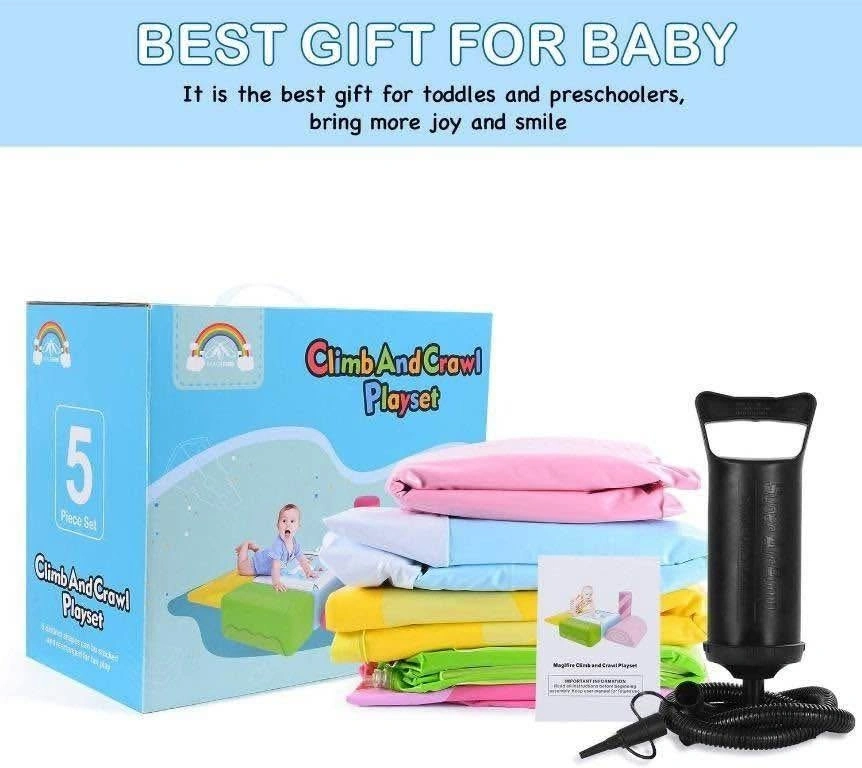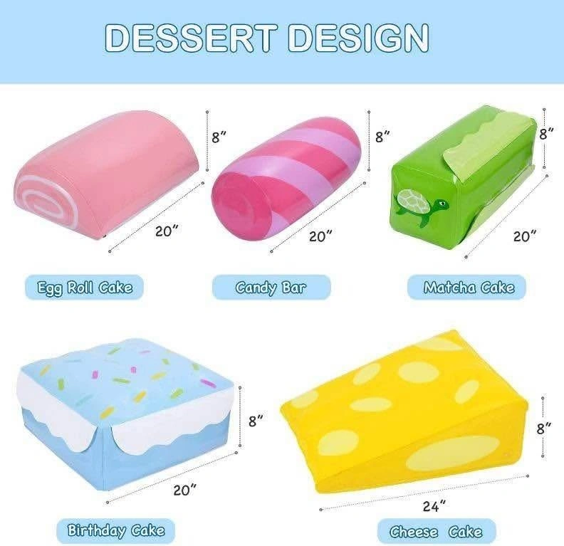 Brand new Magifire inflatable climbing blocks designed for toddlers and infants to climb, crawl, and slide. They have a two-layer design for firm and soft support. The play sets are made of durable, food-grade PVC and are CPC certified. Special velcro ensures blocks connect tightly with no gaps. The blocks include a birthday cake, cheesecake, egg roll cake, and matcha cake in bright colors and cute shapes, so kids can build their dessert kingdom. Kids can develop social interaction and gross motor skills while climbing, crawling, and stacking the blocks. It can also help with brain development, hand-foot coordination, creativity, and hand-eye coordination. Good birthday or Christmas gift for 9-month to 3-year-old kids.
