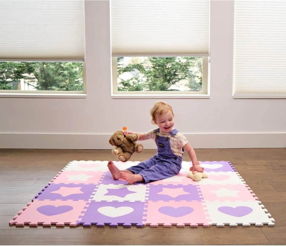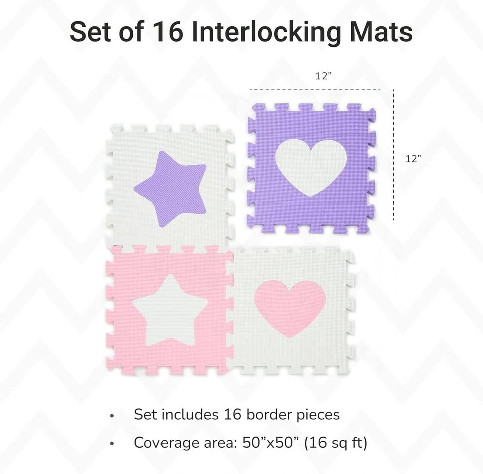 Brand new Tadpoles playmat set, pink/purple/white. BRAND: Tadpoles Size: 12" x 12" Total pcs: 16 MATERIAL | 100 % EVA Foam interlocking floor mats, Non-Toxic soft baby play mat, Foam Floor Puzzle Mat for Kids & Toddlers. Passes all US and European testing requirements. FORM | Baby mat includes 16 foam pieces with removable centers and 16 border pieces. Combine multiple sets of interlocking foam tiles to cover larger areas and create your own unique look SIZING | Each square measure 12"x12". As pictured, the Floor Play Mat set covers 16 square feet. Assembled size with borders is 50 inch x 50 inch. Use 2 or more sets to cover larger areas PURPOSE | For children ages 3 years and up. Use as soft Baby Mat, Tiles Carpet, Padded Floor Mat, soft Baby Play Mat, use in Baby Play Pens, Cushioned Floor Mat, Puzzle Mat, Foam Play Mat for Baby, Kids Foam Puzzle MAINTENANCE | Baby Play Mat is easy to assemble, easy to clean with soap and water