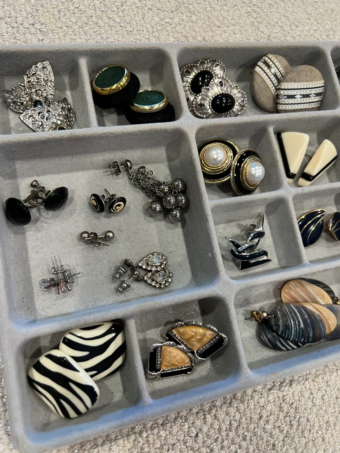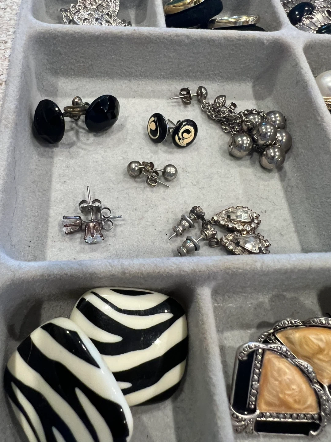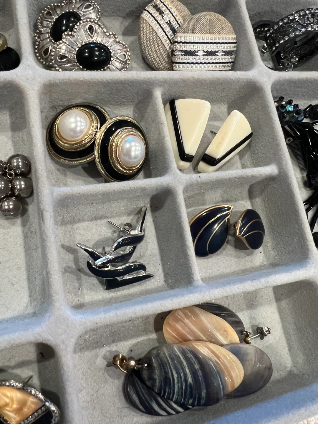 Range of styles, from classic studs to bold statement pieces, each pair offers a unique look… 22 earrings in total Wearable condition, inspected by me (no broken or missing pieces, backing all accounted for) Various closure types - posts, clips, hooks… Preloved Great vintage condition Tray is included Forget the mystery jewelry jars altogether!! Wear it, share it, create something new!! Asking $50 (must take everything, not selling individual pieces) Interested? Message me and please check my other listings…