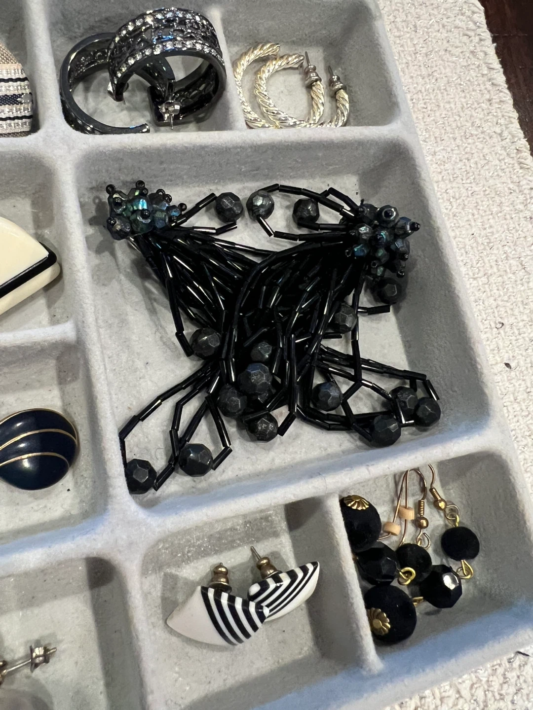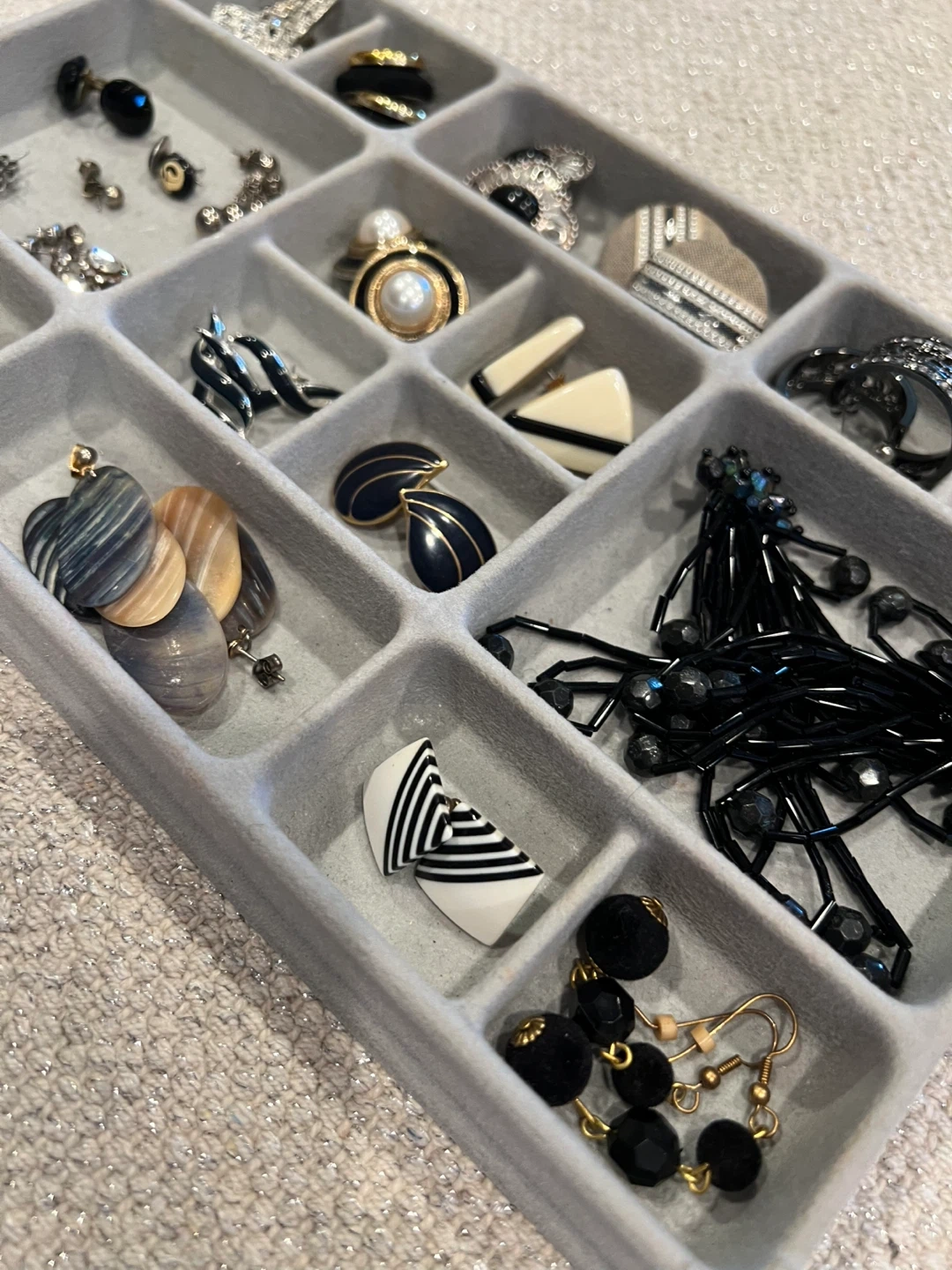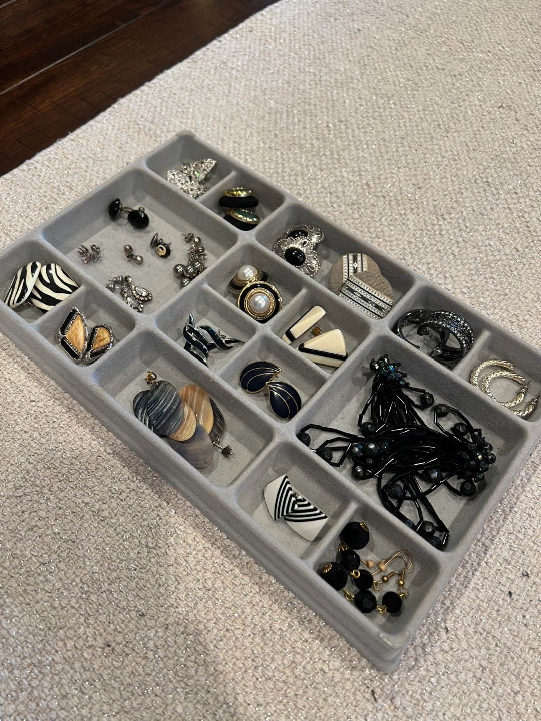 Range of styles, from classic studs to bold statement pieces, each pair offers a unique look… 22 earrings in total Wearable condition, inspected by me (no broken or missing pieces, backing all accounted for) Various closure types - posts, clips, hooks… Preloved Great vintage condition Tray is included Forget the mystery jewelry jars altogether!! Wear it, share it, create something new!! Asking $50 (must take everything, not selling individual pieces) Interested? Message me and please check my other listings…