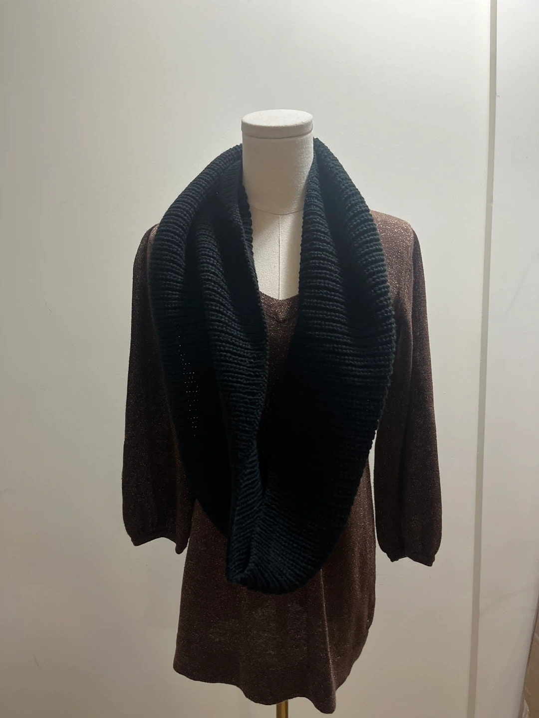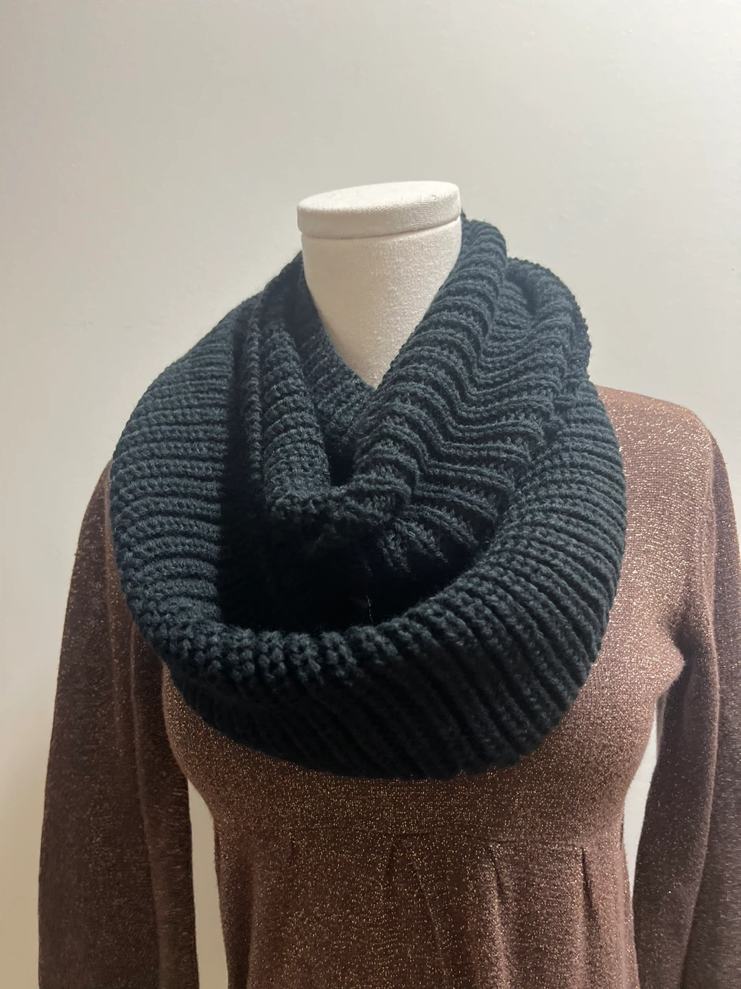 Cozy up with this stylish black knit infinity scarf! It's perfect for adding a touch of warmth and texture to any outfit. The continuous loop design makes it easy to wear in a variety of ways, whether you're layering up for a chilly day or just adding a bit of flair Cozy black knit infinity scarf. Great for the winter or cooler fall weather. Perfect for layering. Brand new, no tags Pickup Brampton or downtown Toronto