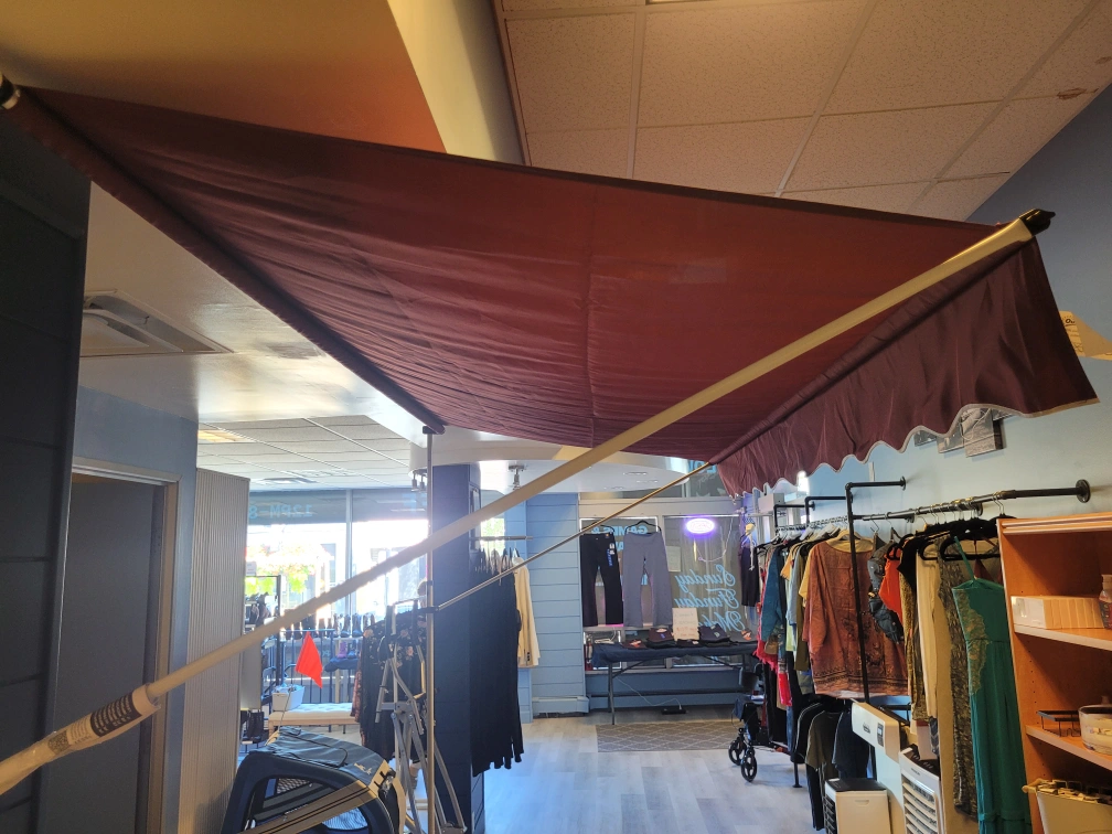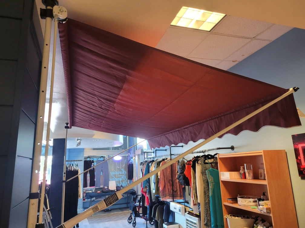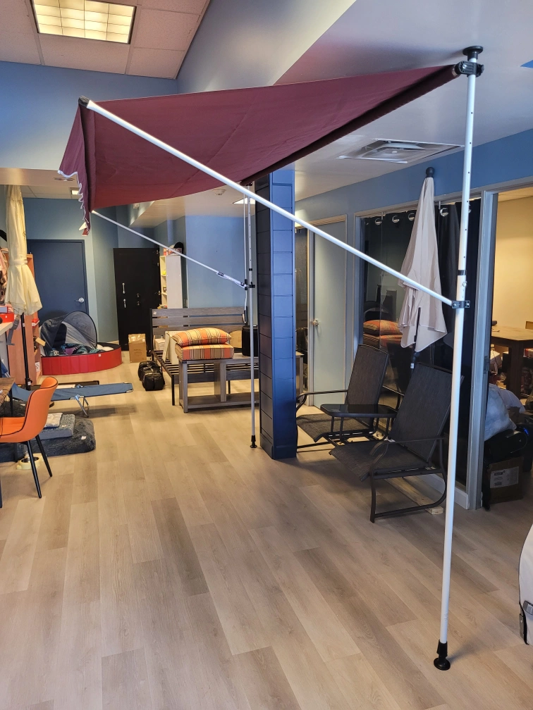 Selling a new manual retractable awning in a burgundy colour. It's in great shape and ready to provide some shade! Perfect for a patio or storefront or take with you camping. For those who want flexibility, our patio awning from Outsunny is your optimum choice. The elegant shade dispenser can be comfortably clamped between the floor and ceiling. The load-bearing telescopic rods can be flexibly adjusted from 5.6' to 9.2'. The frame and the two folding arms are made of powder-coated steel for long-lasting durability. With polyester awning fabric, it protects you from the harmful UV-rays. You can easily open or retract your awning with the hand crank. Features: • Floor to-ceiling retractable awning, suitable for front of the window, on the terrace, balcony or under the porch • Constructed of steel frame and supporting poles, aluminum roller • Height-adjustable telescopic poles between 5.6'-9.2' • Polyester awning fabric provide protection against UV-ray and light rain drops • Angle adjustable and is easy to operate with the hand crank • Assembly required Specification: • Colour: Blue and White • Material: Aluminum, Steel, Polyester • Overall Dimensions: 9.8'L x 4.9'W (300 x 150 cm) • Height of the Telescopic Poles: 5.6'-9.2' (170-280 cm) • Adjustable Angle: 0-90° • Handle Crank Length: 3.9' (1.2m) * Pick up in store at 258 Main Street South, Newmarket (by appointment only to guarantee we are open). *** Payable by cash, debit or credit ***