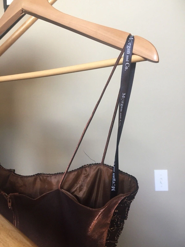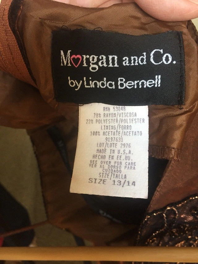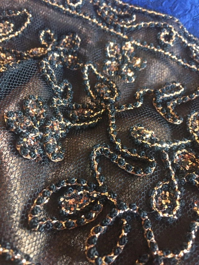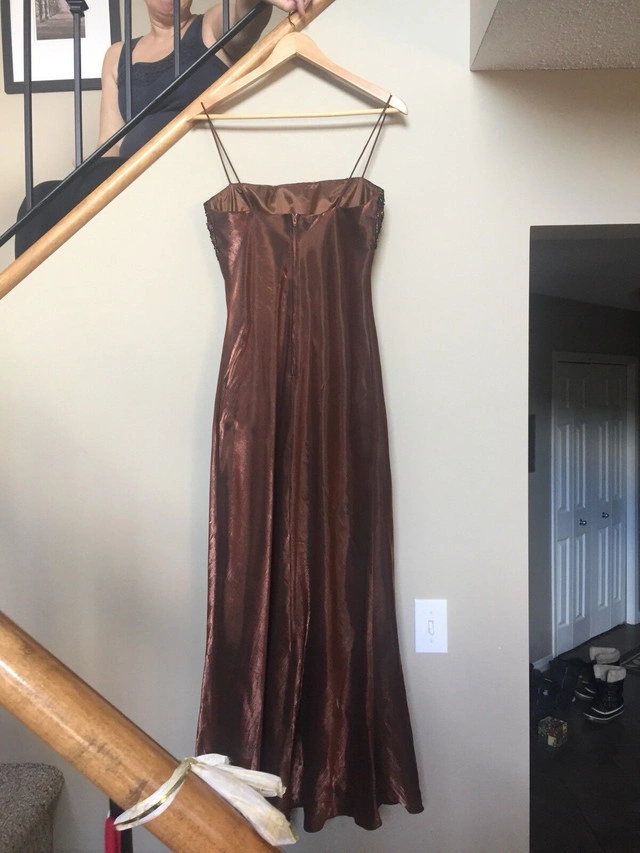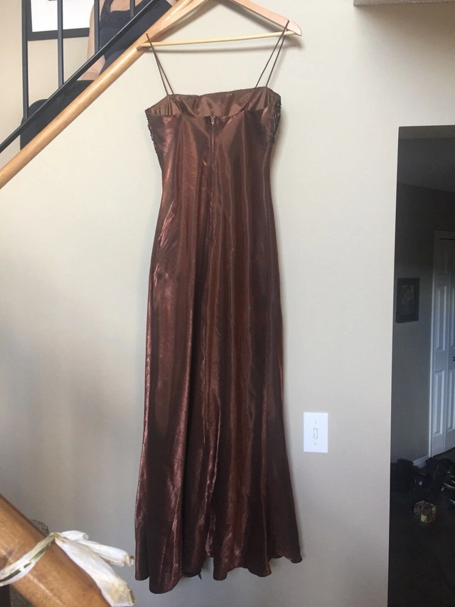 Beautiful floor length gown. Rayon polyester with fully bonded lining. Empire waist, 45” long from under the busy. Fits more like a small 12. Fabric splits in the front and flows beautifully. Sparkly embroidery on the top make this a classic dress. EUC. Pick up in Rocky Ridge NW. Size: Large (12-14)