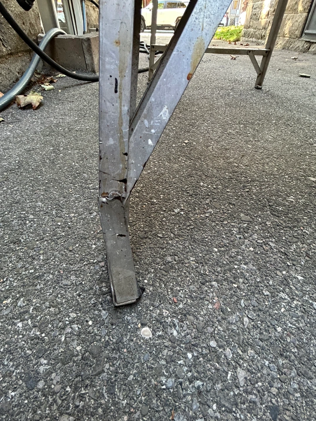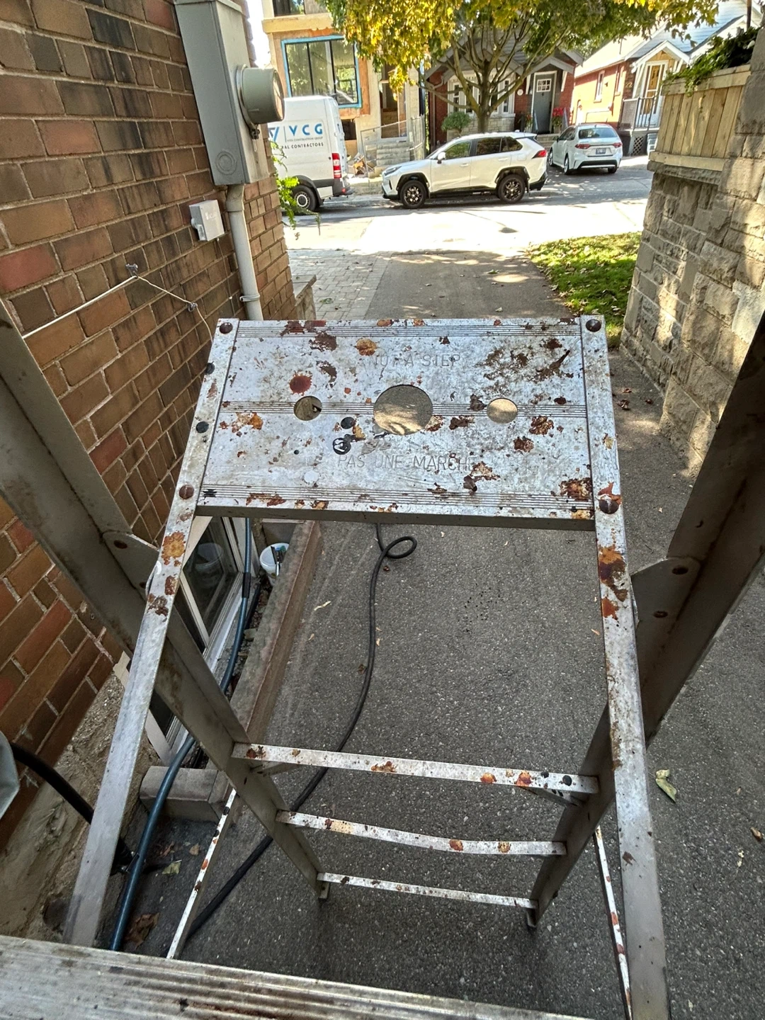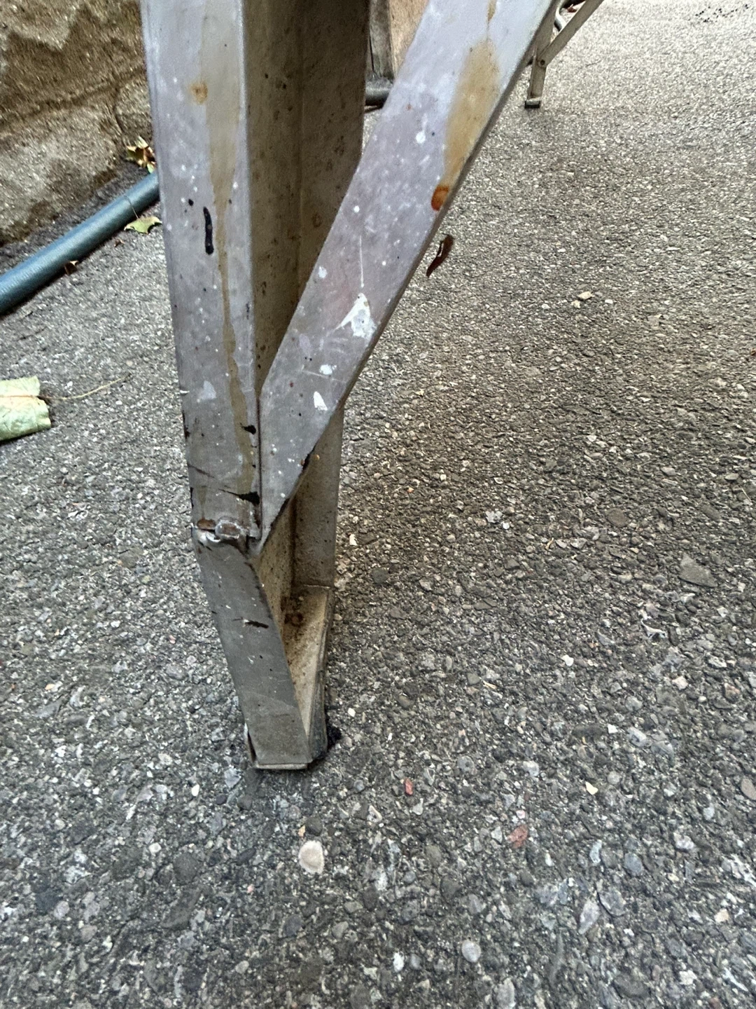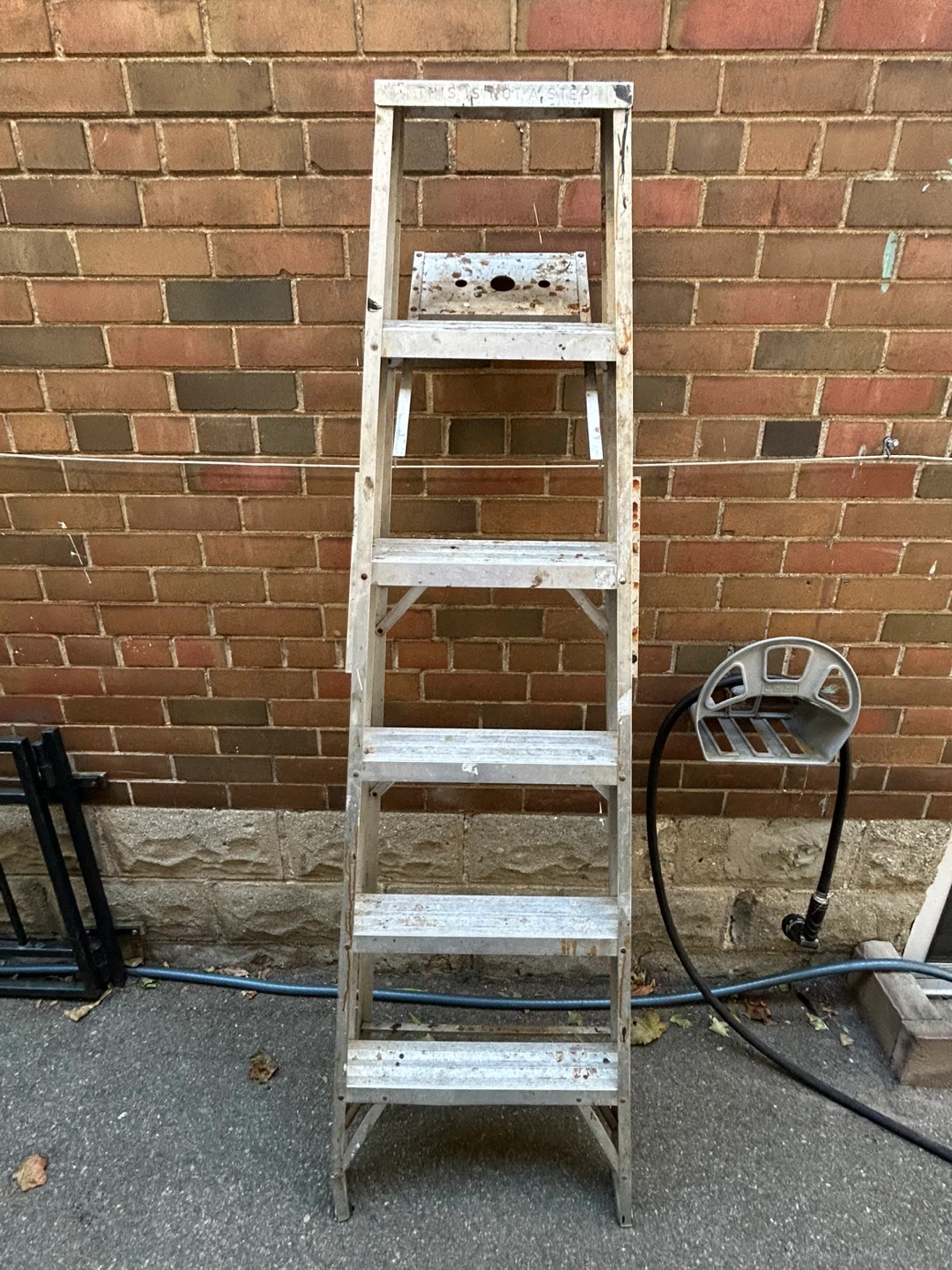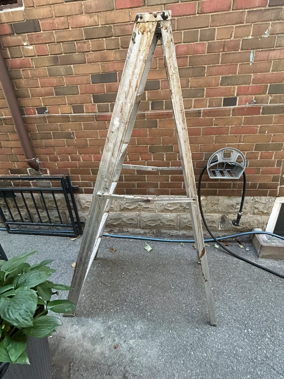 $12 6 foot feet aluminum ladder step DONLANDS O'Connor East York Elmsdale Rd AS IS From my father in law garage work shed 6 feet foot aluminum metal step ladder folding Has paint etc on it Sturdy - but in the past the one leg crimped a little bit It's very stable though and I've used it without problem but want to be up front about it $12.00 Flexible re pickup Elmsdale Road M4J 3M3 Donlands O'Connor East York Don Mills south exit off DVP