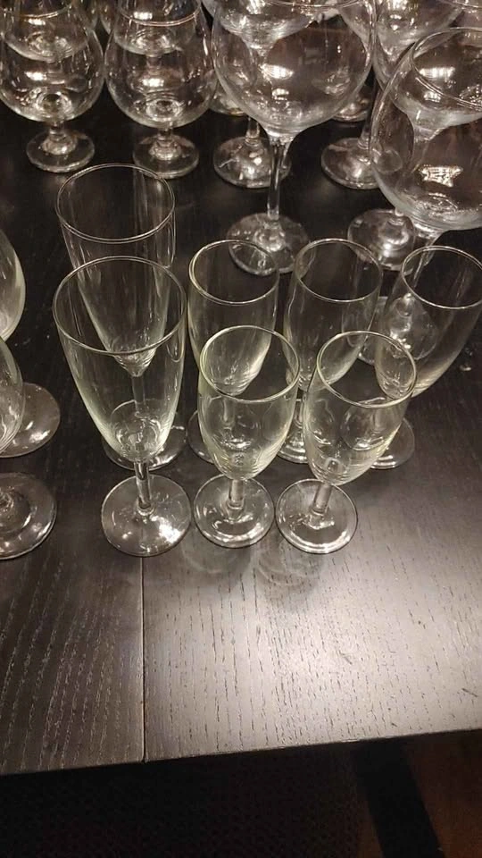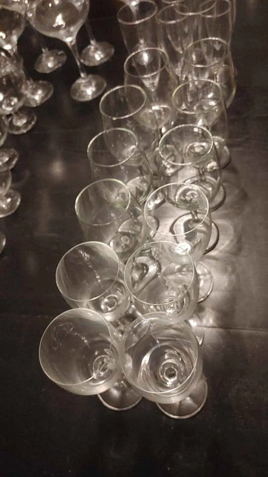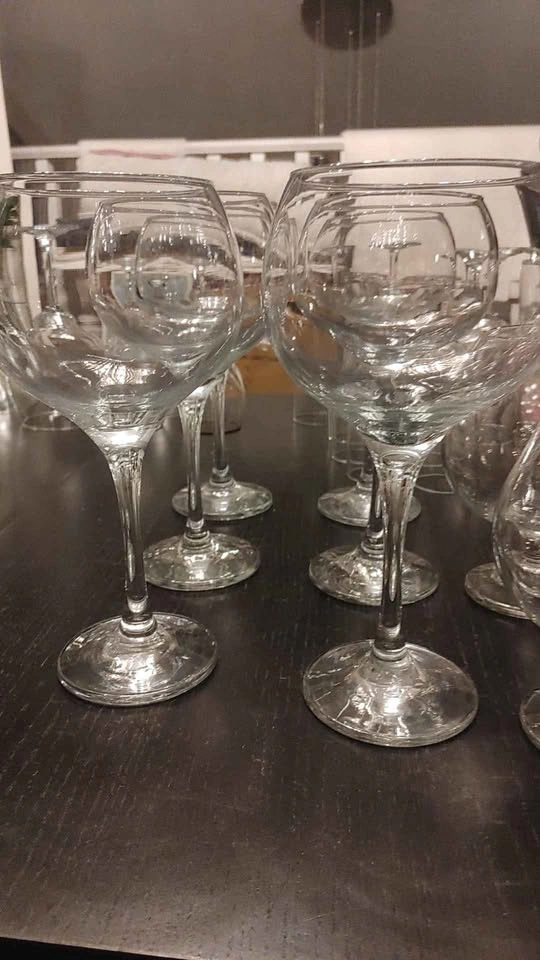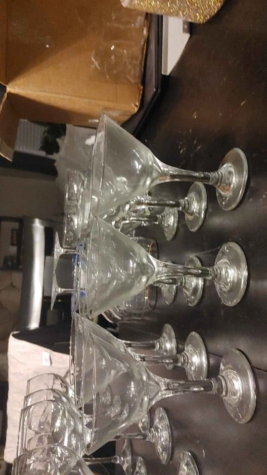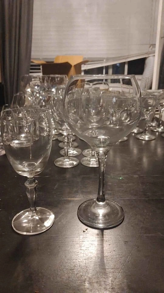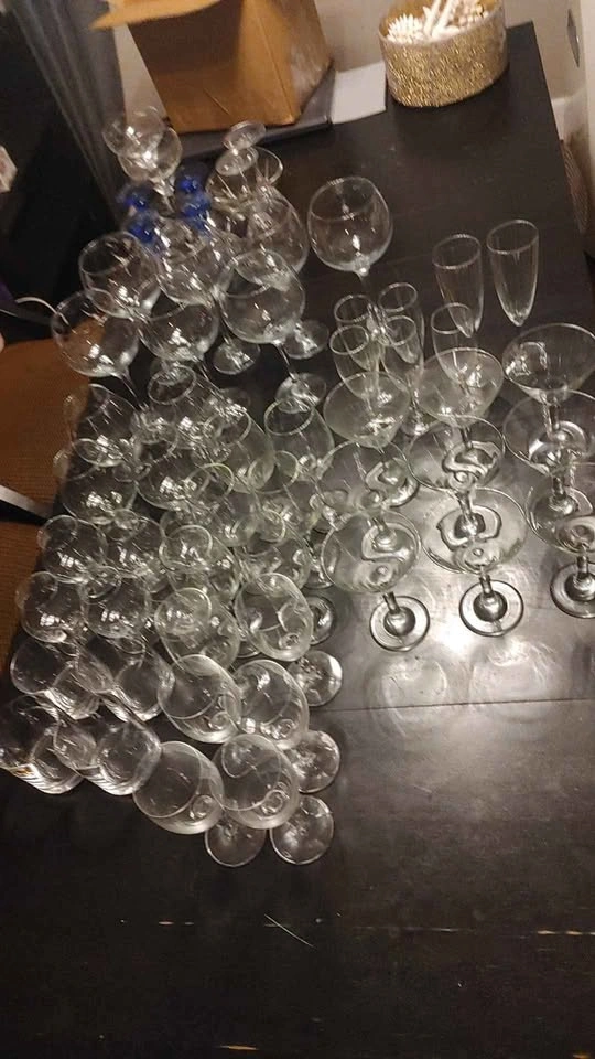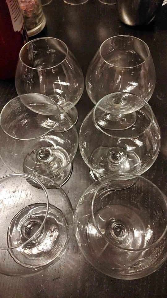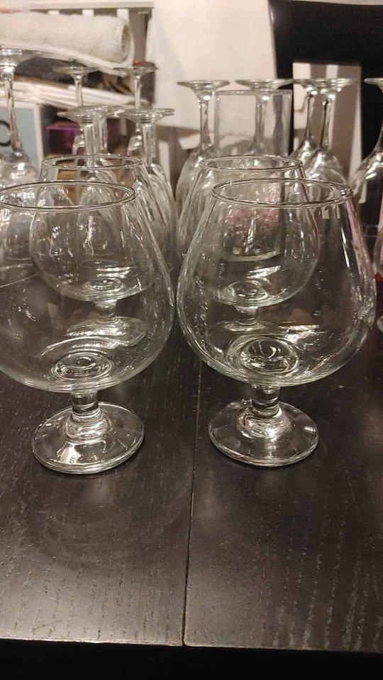 Get ready for the season Glassware 7 red wine goblets 9.5 inches tall. 9 daiquiri glasses, 12 white wine glasses, 4 weighted whiskey glasses, 6 small brandy snifters, 4 large Brandy sniffers. 2 long champagne 5 short champagne all in great shape no nick or scratches